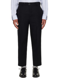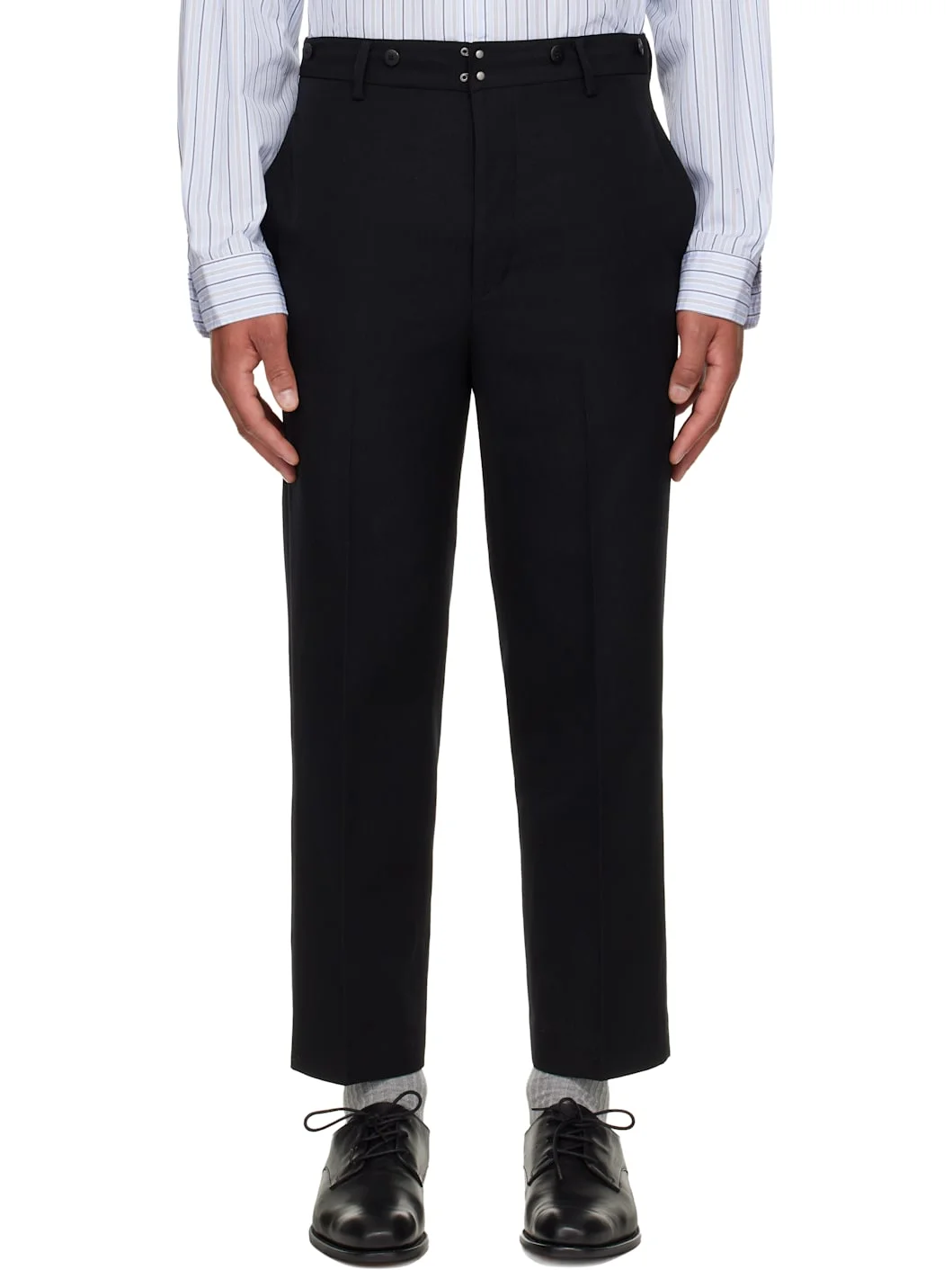Wool-blend twill trousers. · Belt loops · Four-pocket styling · Button fly · Creased legs · Cinch strap at back · Partial satin lining Supplier color: Black Body: 81% wool, 19% linen. Trim: 100% cotton. Lining: 100% rayon. Made in Japan 252487M191000