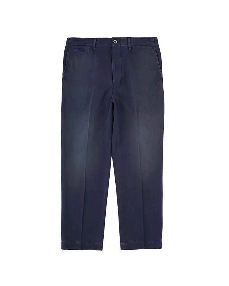 CHINO PANTS DMGD COLOR: BLACK, INDIGO, GREY SIZE: 1, 2, 3, 4, 5 A chino pant with a selvedge finish detail that utilizes a woven long staple cotton. Damaged Finish Red Selvedge Slim silhouette High-rise Custom "PEERLESS" engraved metal button Custom Cinch-Back detail 100% COTTON UNIT:cm Please be aware that there may be slight variations in the color of the fabric and pattern than shown in the images. There will be slight shrinkage when washing for the first time. SIZE LENGTH INSEAM WAIST THIGH WIDTH HEM 1 93.5 64.6 78 29.7 17.7 2 96 66.6 83 30.9 18.9 3 98.5 68.6 88 32.2 20.2 4 101 70.6 93 33.4 21.4 5 103.5 72.6 98 34.7 22.7