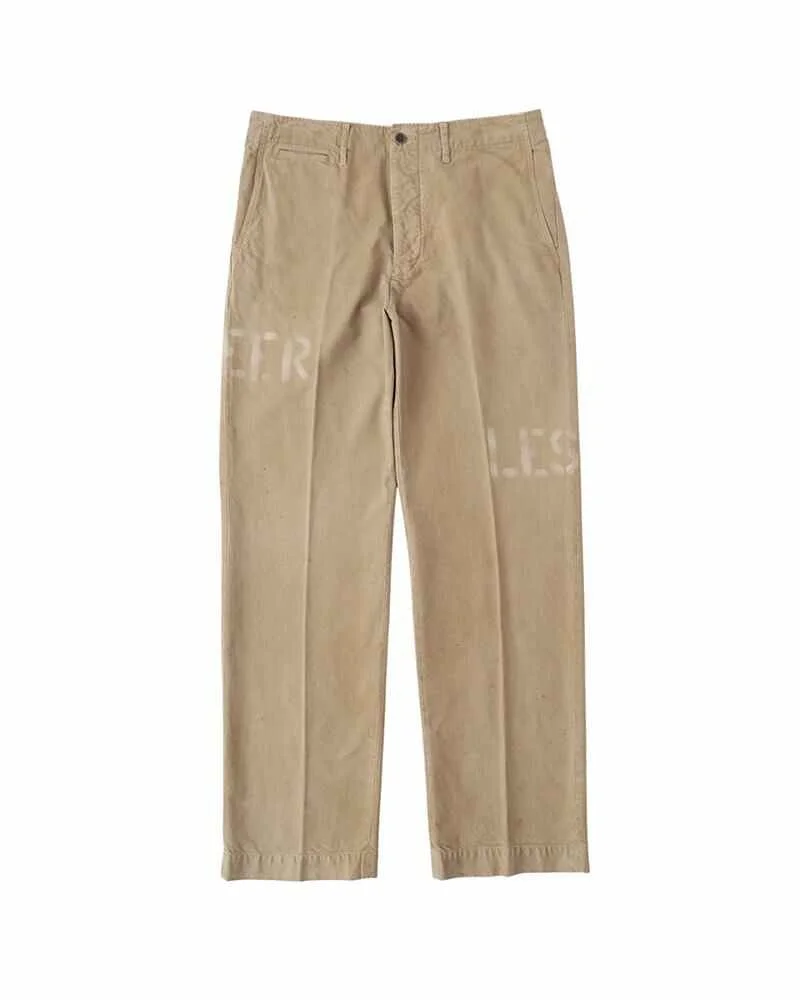 CHINO PANTS HW DMGD COLOR : BEIGE , NAVY , BLUE SIZE : 1 , 2 , 3 , 4 , 5 Chino pants made from high density, super long staple cotton Garment dyed Damage processed High rise Hand-stenciled paint detail Original metal buttons Please Note : 100% Cotton SIZE 1 : Waist 30.7 , Inseam 30.3 , Thigh width 12.7 , Hem width 8.6 (inch) SIZE 2 : Waist 32.7 , Inseam 31.1 , Thigh width 13.2 , Hem width 9.1 (inch) SIZE 3 : Waist 34.6 , Inseam 31.9 , Thigh width 13.7 , Hem width 9.5 (inch) SIZE 4 : Waist 36.6 , Inseam 32.6 , Thigh width 14.1 , Hem width 10 (inch) SIZE 5 : Waist 38.6 , Inseam 33.4 , Thigh width 14.6 , Hem width 10.5 (inch) Please be aware that the fabric used may vary in color and pattern from item to item. Products may shrink slightly when washed.