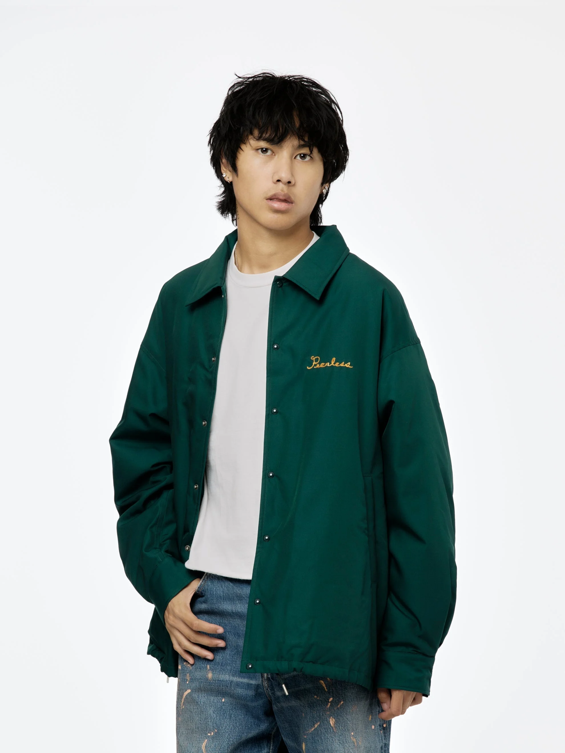 A Coach Jacket made from a densely woven Wool/Silk army twill fabric Fine Wool Pile Lining Pressed Finish Custom Snap Buttons 62% WOOL 38% SILK