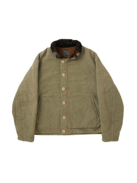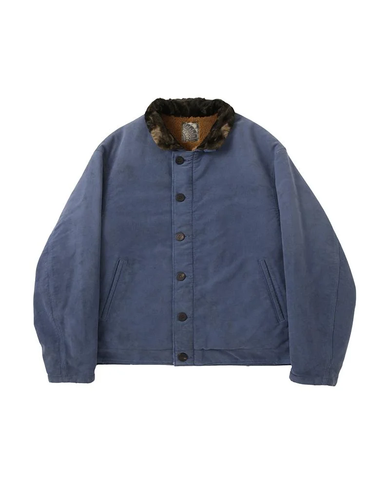 DECKHAND JKT COLOR: NAVY, OLIVE, BEIGE SIZE: 1, 2, 3, 4, 5 A Deckhand Jacket made with a specially processed cotton and nylon german cord cloth material Lined with a French Vegetable Tanned Sheepskin Karakul Lamb collar Garment Dyed and Damaged Finish Custom Ribbing Custom Water Buffalo Buttons and Zip Fastener 64% COTTON 36% NYLON UNIT:cm : Please be aware that there is a possibility for slight variations in the color appearance and pattern on the fabric that is utilized for this product; each finished garment may be different from the displayed product image. There may also be some shrinkage following the first wash of this product. The Kofu, Bandana, Blanket, African Indigo textile and vintage fabrics used for the name tag and actual product itself vary in color and pattern where no two pieces are alike. Additionally, the degree of deterioration will vary with each fabric depending on its age and historical use so these products should be considered more fragile in comparison to our regularly manufactured products. SIZE LENGTH CHEST SHOULDER SLEEVE 1 66.5 117.4 55 59.6 2 68.5 121.4 56.5 61.1 3 70.5 125.4 58 62.6 4 72.5 130.4 60 64.1 5 74.5 135.4 62 65.6
