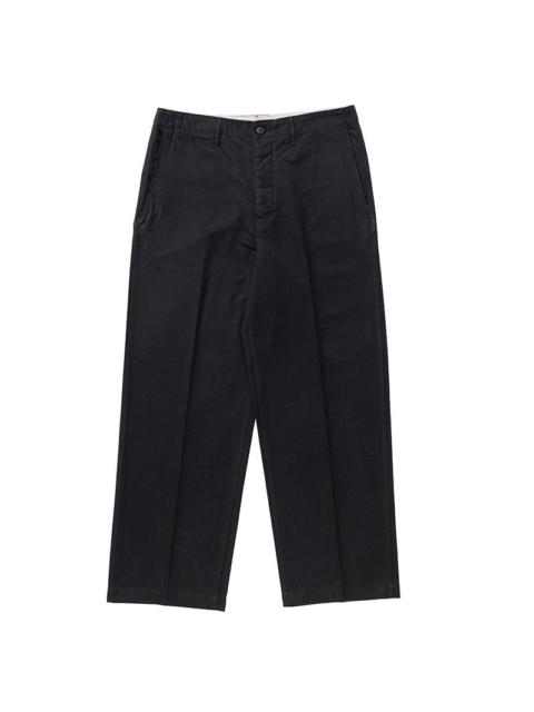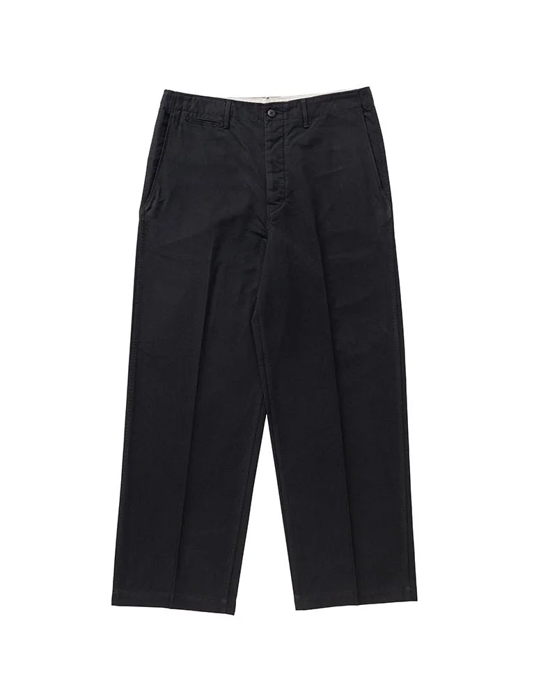EX WIDE CHINO PANTS COLOR: BLACK, NAVY, BEIGE SIZE: 1, 2, 3, 4, 5 Custom High Density Weave Long Staple Cotton Chino Pants One Wash Wide Straight Leg Silhouette and High-Rise Custom Water Buffalo Buttons 100% Cotton UNIT:cm : Please be aware that there may be slight variations in the color of the fabric and pattern than shown in the images. There will be slight shrinkage when washing for the first time. SIZE LENGTH INSEAM WAIST THIGH WIDTH HEM 1 104 72 79 33.1 23.1 2 106.5 74 84 34.3 24.3 3 109 76 89 35.5 25.5 4 111.5 78 94 36.7 26.7 5 114 80 99 37.9 27.9