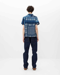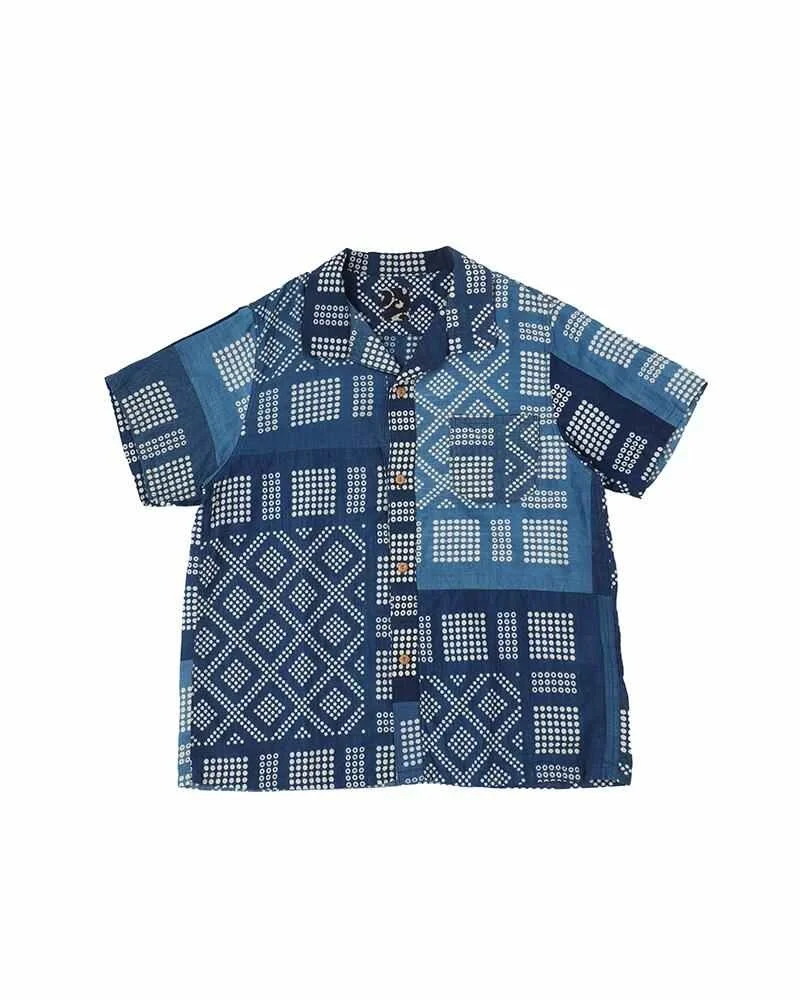FAIRWAY SHIRT S/S (N.D.) COLOR: INDIGO PATTERN, INDIGO SIZE: 1, 2, 3, 4, 5 Patchwork shirt made from original bandanas Natural dye finish Original bamboo buttons 100% COTTON UNIT:cm Please be aware that the vintage fabric, bandanas, blanket, and african indigo fabric used may vary in color and pattern from item to item. With time, these fabrics may also become weaker and less tear-resistant. Also, due to the use of natural dyes, the outward appearance of items may vary slightly from one another. For certain items, mud may be applied for an added effect. Products may shrink slightly when washed. SIZE LENGTH CHEST SHOULDER SLEEVE 1 63 106.8 38.7 20.6 2 65 110.8 40.2 21.3 3 67 114.8 41.7 22 4 69 119.8 43.7 22.7 5 71 124.8 45.7 23.4