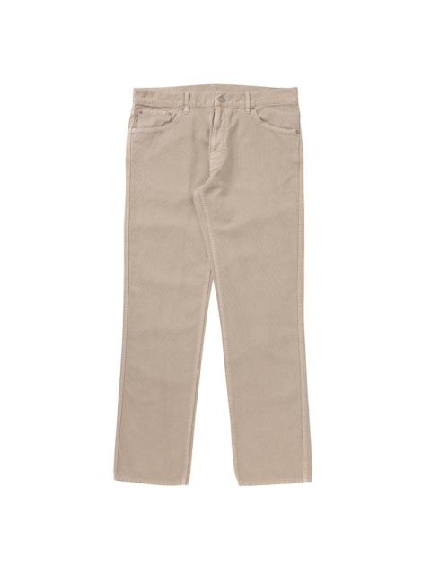 FLUXUS 03 COLOR: BLACK, NAVY, BEIGE SIZE: 1, 2, 3, 4, 5 Dry Pique fabric 5 Pocket Pant Garment Dyed Damaged Finish Regular Slim Fit, Tapered Silhouette Medium-Rise Zip Fly Custom zip fastener, Copper buttons and rivets Natural Dyed Buckskin patch 100% COTTON UNIT:cm Please be aware that there may be slight variations in the color of the fabric and pattern than shown in the images. There will be slight shrinkage when washing for the first time. SIZE LENGTH INSEAM WAIST THIGH WIDTH HEM 1 103.7 79 84 31 18.7 2 106.2 81 89 32.2 19.9 3 108.7 83 94 33.5 21.2 4 111.2 85 99 34.7 22.4 5 113.7 87 104 36 23.7