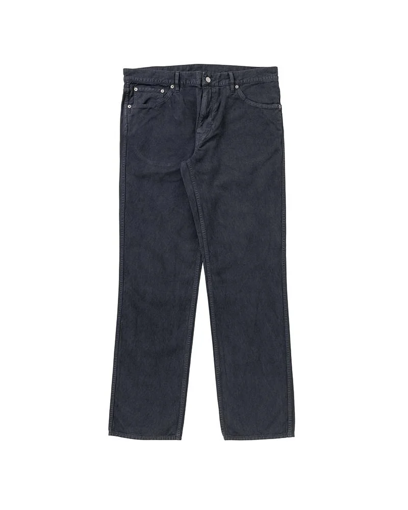 FLUXUS 03 COLOR: BLACK, NAVY, BEIGE SIZE: 1, 2, 3, 4, 5 Dry Pique fabric 5 Pocket Pant Garment Dyed Damaged Finish Regular Slim Fit, Tapered Silhouette Medium-Rise Zip Fly Custom zip fastener, Copper buttons and rivets Natural Dyed Buckskin patch 100% COTTON UNIT:cm Please be aware that there may be slight variations in the color of the fabric and pattern than shown in the images. There will be slight shrinkage when washing for the first time. SIZE LENGTH INSEAM WAIST THIGH WIDTH HEM 1 103.7 79 84 31 18.7 2 106.2 81 89 32.2 19.9 3 108.7 83 94 33.5 21.2 4 111.2 85 99 34.7 22.4 5 113.7 87 104 36 23.7