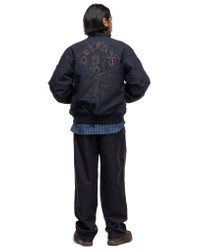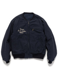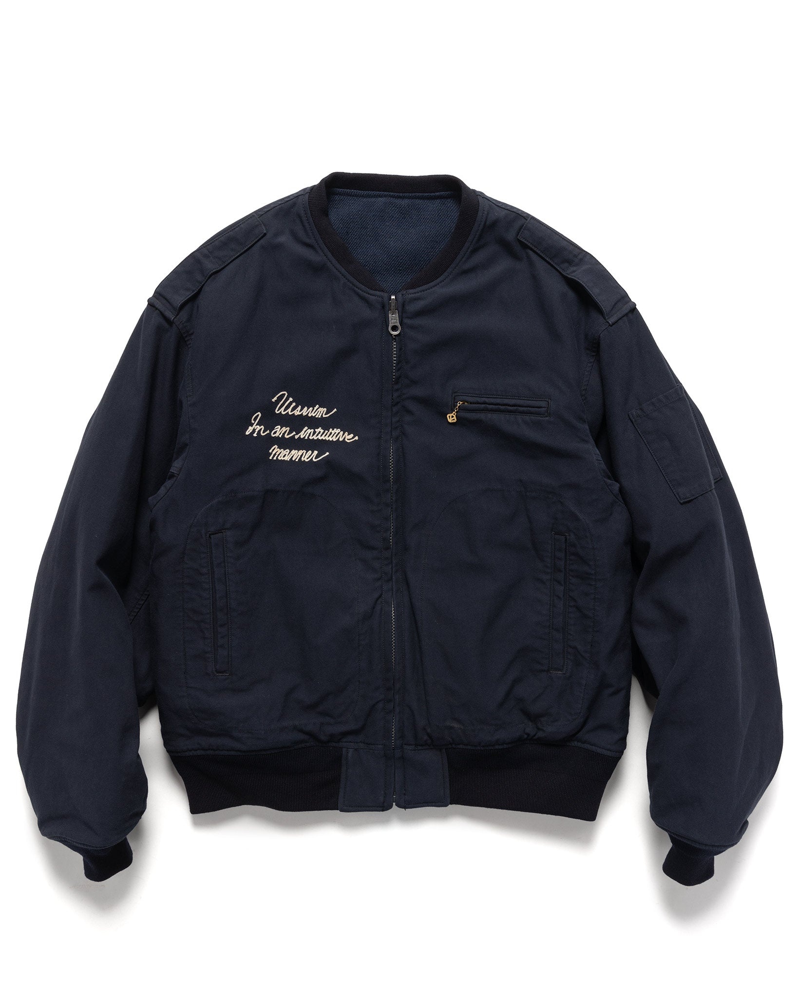 The visvim Gunner Jacket in Acala Navy brings together rugged construction and refined details in a reversible design. Its front side, made from processed cotton and nylon satin, gives a smooth finish, while the reverse features a wool-linen blend, offering depth and texture. Carefully distressed and naturally dyed, the jacket showcases a rich, authentic color. Embroidered with "Visvim In an intuitive manner" on the chest and adorned with the bold "PEERLESS Acala" print on the back, it strikes a balance between vintage-inspired style and modern craftsmanship. Complete with Swiss riri zippers and original chain sliders, this jacket brings versatility and character to your wardrobe. DETAILS - 124205013004 - Material: 50% cotton, 50% polyamide - Lining: 50% wool, 50% linen - Filling: 100% polyester - Naturally dyed, distressed finish - Relaxed fit - Dropped shoulders - Zippered front closure - Swiss riri zipper with chain sliders - Zippered chest pocket - Reversible design - Embroidered front, printed back - Ribbed cuff, collar, and hem - Made in Japan