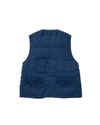GUSTO DOWN VEST COLOR: INDIGO, LT.BROWN, BEIGE SIZE: 1, 2, 3, 4, 5 A Vest made from a densely woven fine Linen fabric Garment Dyed Damaged Finish White Goose Down Fill Custom Water Buffalo Buttons 100% LINEN UNIT:cm : Please be aware that there may be slight variations in the color of the fabric and pattern than shown in the images. There will be slight shrinkage when washing for the first time. SIZE LENGTH CHEST SHOULDER 1 64.6 106.3 41.2 2 66.6 110.3 42.7 3 68.6 114.3 44.2 4 70.6 119.3 46.2 5 72.6 124.3 48.2