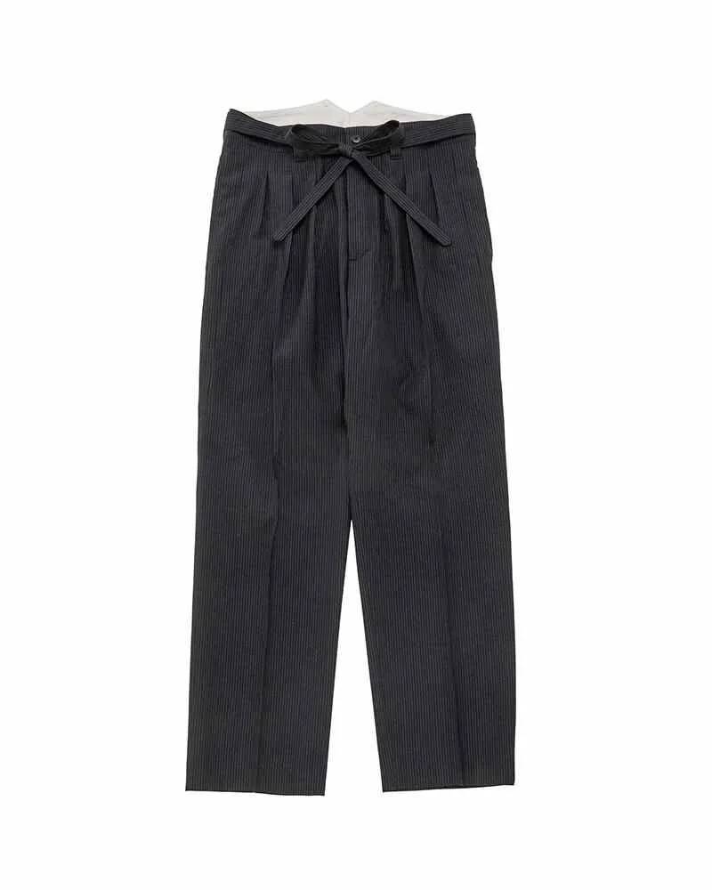 HAKAMA PANTS SANTOME COLOR: NAVY, CHARCOAL SIZE: 1, 2, 3, 4, 5 Hakama Pants woven with a multiple thread blend Pressed Finish Custom Water Buffalo Buttons 65% WOOL 35% LINEN (CHARCOAL) 61% WOOL 34% LINEN 4% SILK 1% COTTON (NAVY) UNIT:cm Please be aware that there may be slight variations in the color of the fabric and pattern than shown in the images. There will be slight shrinkage when washing for the first time. SIZE LENGTH INSEAM WAIST THIGH WIDTH HEM 1 107.5 73 82.5 37.9 21.4 2 110 75 87.5 39.1 22.6 3 112.5 77 92.5 40.3 23.8 4 115 79 97.5 41.5 25 5 117.5 81 102.5 42.7 26.2