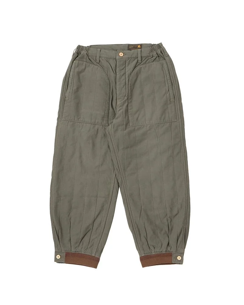 HW CARROL PANTS COLOR: NAVY, OLIVE, MUSTARD SIZE: 1, 2, 3, 4, 5 A quilted pant made from a woven back satin material that consists of a specially processed cotton and nylon yarn Damaged Finish Natural Dye Finish Treatment Custom Water Buffalo buttons 50% NYLON 50% COTTON UNIT:cm : Items that are finished with Natural Dye will experience different textural finishes where no two are alike. Also, there may be pieces that have mud left on the finished garment as a result of the treatment. Please be aware that there may also be slight variations in the color of the fabric and pattern than shown in the images. There will be slight shrinkage when washing for the first time. SIZE LENGTH INSEAM WAIST THIGH WIDTH HEM 1 91 59.2 74 36.1 17.7 2 93.5 61.2 78 37.1 18.7 3 96 63.2 82 38.1 19.7 4 98.5 65.2 87 39.3 20.9 5 101 67.2 92 40.5 22.1