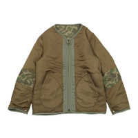 Camouflage liner jacket made from specially processed cotton Damage processed Polyester filling Original snap buttons Vintage CROWN® zippers Reversible Please Note : Shell : 100% Cotton Lining : 100% Rayon Filling : 100% Polyester SIZE 1 : Length 66.2 , Shoulder 39.8 , Sleeve 58.9 , Chest 110.2 (cm) SIZE 2 : Length 68.7 , Shoulder 41.3 , Sleeve 60.4 , Chest 114.2 (cm) SIZE 3 : Length 71.2 , Shoulder 42.8 , Sleeve 61.9 , Chest 118.2 (cm) SIZE 4 : Length 73.7 , Shoulder 44.8 , Sleeve 63.4 , Chest 123.2 (cm) SIZE 5 : Length 76.2 , Shoulder 46.8 , Sleeve 64.9 , Chest 128.2 (cm) The fabric used may vary in color and pattern from item to item. Products may shrink slightly when washed.