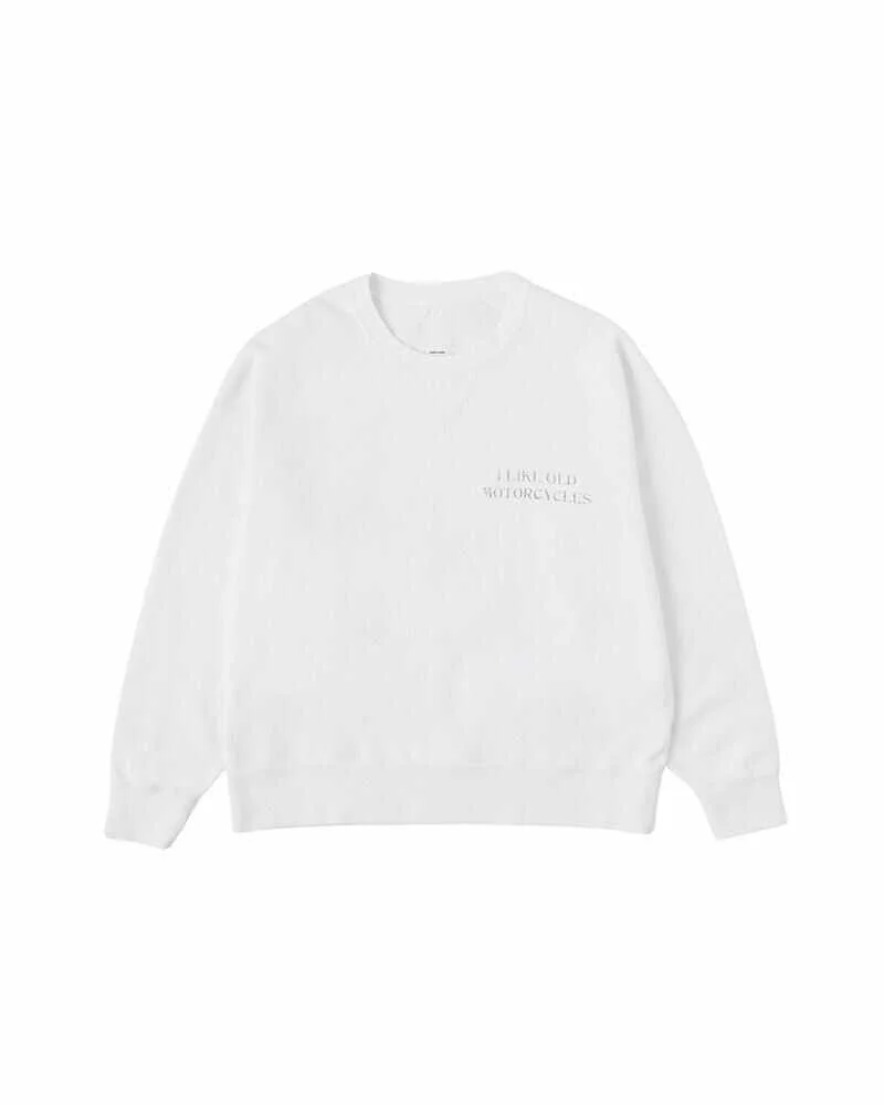 JUMBO SB SWEAT L/S COLOR: WHITE, WHITE PATTERN SIZE: 1, 2, 3, 4, 5 White = I Like Old Cars White Pattern = I Like Old Motorcycles Looped pile lined crew neck sweatshirt Jumbo silhouette Silk screen print detail Please Note : 100% Cotton SIZE 1 : Length 63 , Shoulder 61 , Sleeve 47.5 , Chest 110 (cm) SIZE 2 : Length 65 , Shoulder 63 , Sleeve 49 , Chest 115 (cm) SIZE 3 : Length 67 , Shoulder 65 , Sleeve 50.5 , Chest 120 (cm) SIZE 4 : Length 69.5 , Shoulder 67 , Sleeve 52 , Chest 125 (cm) SIZE 5 : Length 72 , Shoulder 69 , Sleeve 53.5 , Chest 130 (cm) The color and pattern of the fabric used may differ slightly from the image. Some shrinkage may occur after washing. Please be aware.