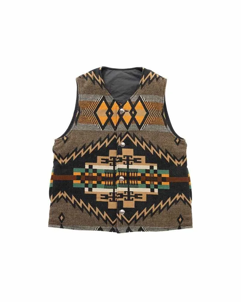 KORA DOWN VEST COLOR: BLACK, BLUE SIZE: 1, 2, 3, 4, 5 A Down Vest made from a custom blanket fabric consisting of Wool / Linen / Cotton Damaged Finish Natural Dye Finish White Goose Down Fill Vintage Concho Button Custom Water Buffalo Buttons Reversible style 48% WOOL 45% LINEN 7% COTTON UNIT:cm Items that are finished with Natural Dye will experience different textural finishes where no two are alike. Also, there may be pieces that have mud left on the finished garment as a result of the treatment. Please be aware that there may also be slight variations in the color of the fabric and pattern than shown in the images. There will be slight shrinkage when washing for the first time. SIZE LENGTH CHEST SHOULDER 1 65.5 109.4 38 2 67.5 113.4 39.5 3 69.5 117.4 41 4 71.5 122.4 43 5 73.5 127.4 45