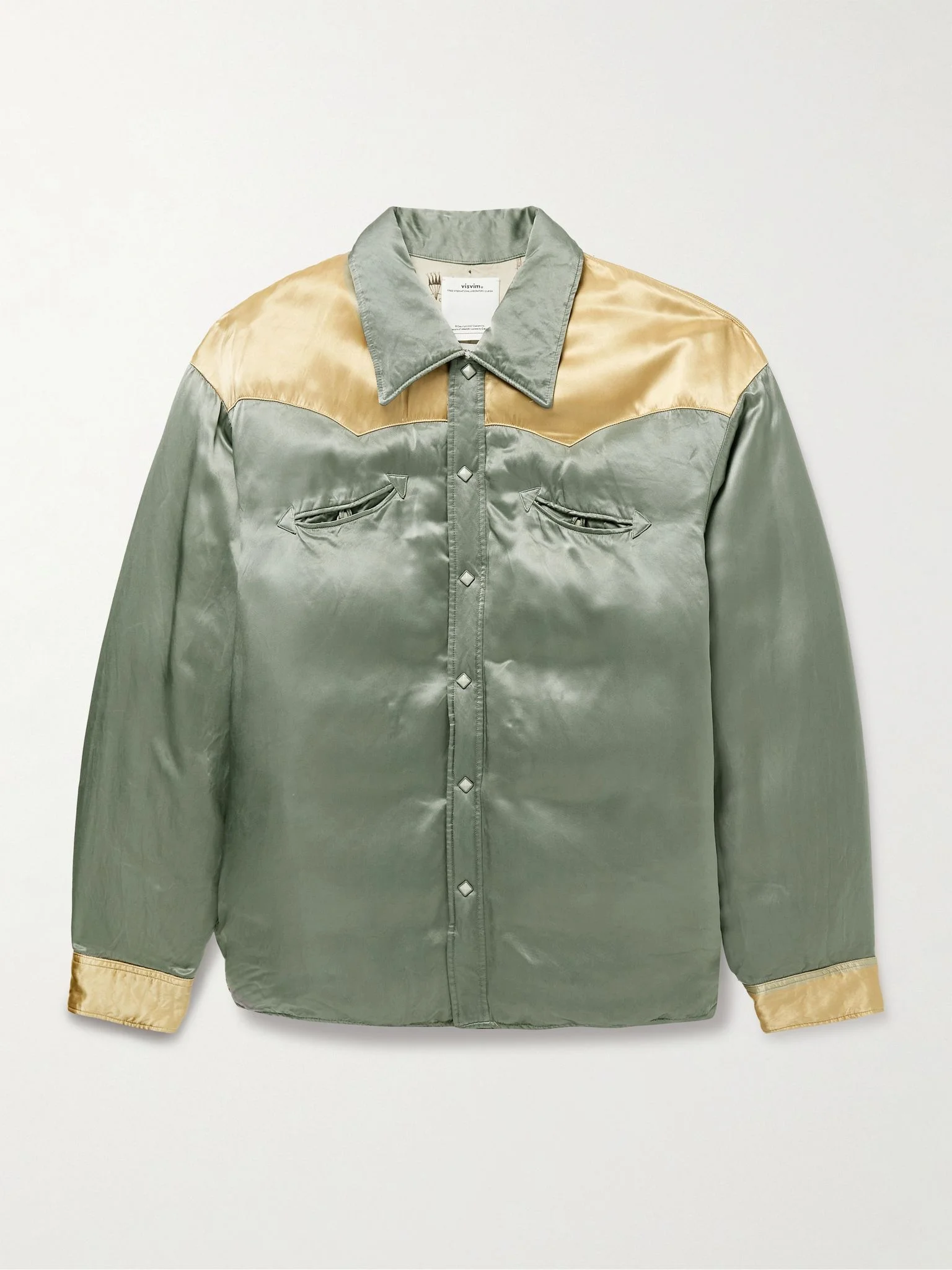 visvim’s bomber jacket has a timeless Western design, so you’ll wear it for years to come. It’s cut for a loose fit from satin and filled with insulating down and has contrasting shoulders and cuffs. Size & Fit - Size 1 = S, 2 = M, 3 = L, 4 = XL and 5 = XXL - Fits true to size. Take your normal size - Designed for a loose fit - Padded, non-stretchy fabric - Model is shown wearing a 2 - Model measures: waist size 30, height 6'1"/ 185cm Details & Care - Army-green and mustard satin - Snap fastenings - 100% rayon; trim: 100% cotton; filling: 93% down, 7% feathers (Goose); lining: 100% rayon - Dry clean