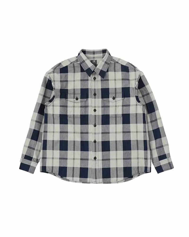 LUMBER L/S (N.D.) COLOR: DK.INDIGO SIZE: 1, 2, 3, 4, 5 Long sleeve shirt made from a Cotton/Linen fabric One Wash Natural dyed Original buffalo buttons 87% Cotton 13% Linen SIZE 1 : Length 71.5 , Shoulder 57.4 , Sleeve length 56.1 , Chest 123 (cm) SIZE 2 : Length 74 , Shoulder 58.9 , Sleeve length 57.6 , Chest 127 (cm) SIZE 3 : Length 76.5 , Shoulder 60.4 , Sleeve length 59.1 , Chest 131 (cm) SIZE 4 : Length 79 , Shoulder 62.4 , Sleeve length 60.6 , Chest 136 (cm) SIZE 5 : Length 81.5 , Shoulder 64.4 , Sleeve length 62.1 , Chest 141 (cm) Please be aware that the vintage fabric, bandanas, blanket, and african indigo fabric used may vary in color and pattern from item to item. With time, these fabrics may also become weaker and less tear-resistant. Also, due to the use of natural dyes, the outward appearance of items may vary slightly from one another. For certain items, mud may be applied for an added effect. Products may shrink slightly when washed.