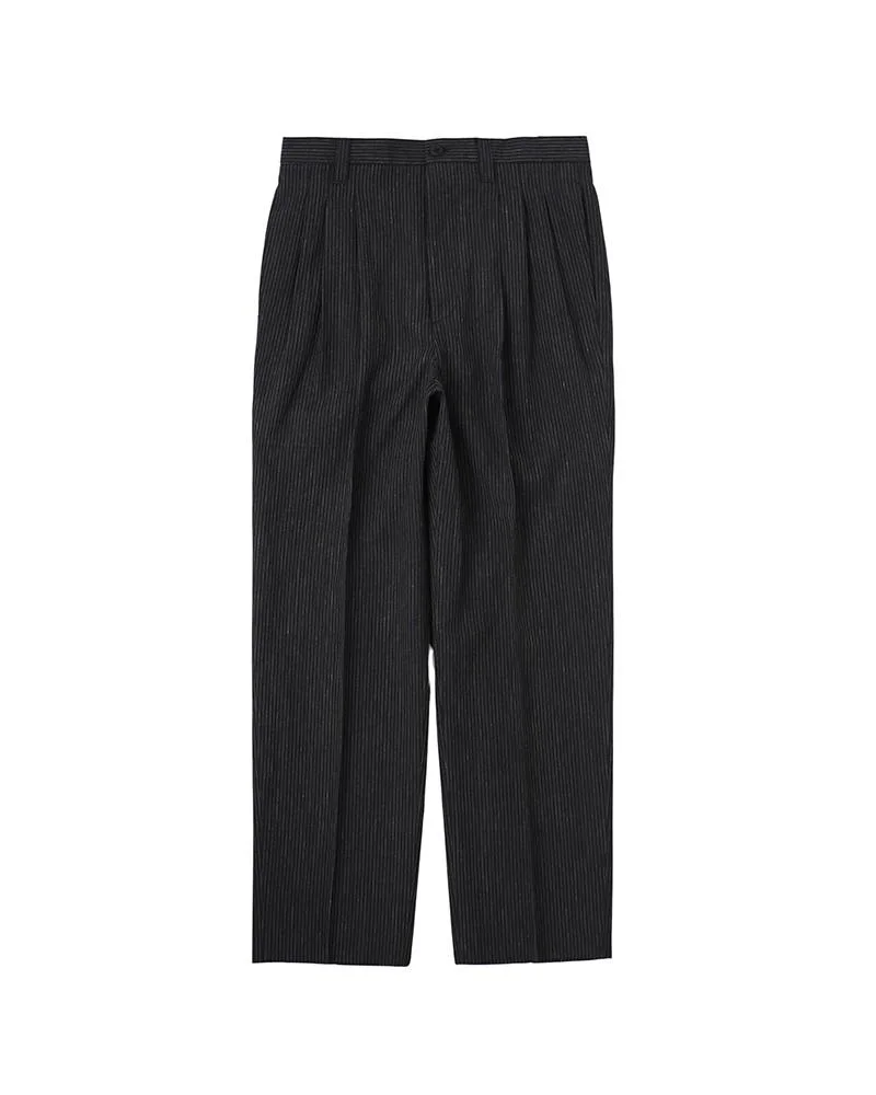 MCCLOUD SLACKS SANTOME COLOR: NAVY, CHARCOAL SIZE: 1, 2, 3, 4, 5 Slacks Pants woven with a multiple thread blend Pressed Finish Custom Water Buffalo Buttons 66% LINEN 19% WOOL 15% COTTON (CHARCOAL) 64% LINEN 19% WOOL 17% COTTON (NAVY) UNIT:cm Please be aware that there may be slight variations in the color of the fabric and pattern than shown in the images. There will be slight shrinkage when washing for the first time. SIZE LENGTH INSEAM WAIST THIGH WIDTH HEM 1 105 73.2 81 35.5 21.2 2 107.5 75.2 86 36.7 22.4 3 110 77.2 91 37.9 23.6 4 112.5 79.2 96 39.1 24.8 5 115 81.2 101 40.3 26
