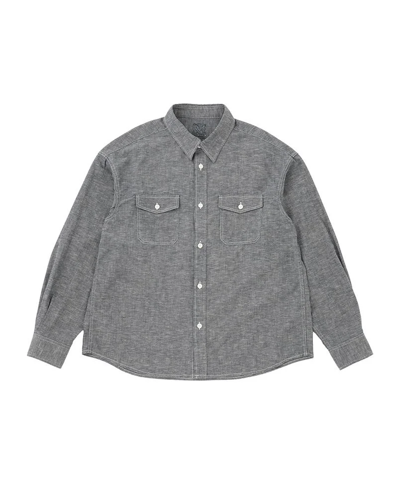 PIONEER CHAMBRAY L/S COLOR: INDIGO, LT.INDIGO SIZE: 1, 2, 3, 4, 5 A shirt made with a woven long staple cotton chambray material featuring a selvedge finish Damaged Finish Custom Water Buffalo Buttons 100% COTTON UNIT:cm : Please be aware that there is a possibility for slight variations in the color appearance and pattern on the fabric that is utilized for this product; each finished garment may be different from the displayed product image. There may also be some shrinkage following the first wash of this product. The Kofu, Bandana, Blanket, African Indigo textile and vintage fabrics used for the name tag and actual product itself vary in color and pattern where no two pieces are alike. Additionally, the degree of deterioration will vary with each fabric depending on its age and historical use so these products should be considered more fragile in comparison to our regularly manufactured products. SIZE LENGTH CHEST SHOULDER SLEEVE 1 69.8 115 57 57.4 2 72.3 119 58.5 58.9 3 74.8 123 60 60.4 4 77.3 128 62 61.9 5 79.8 133 64 63.4