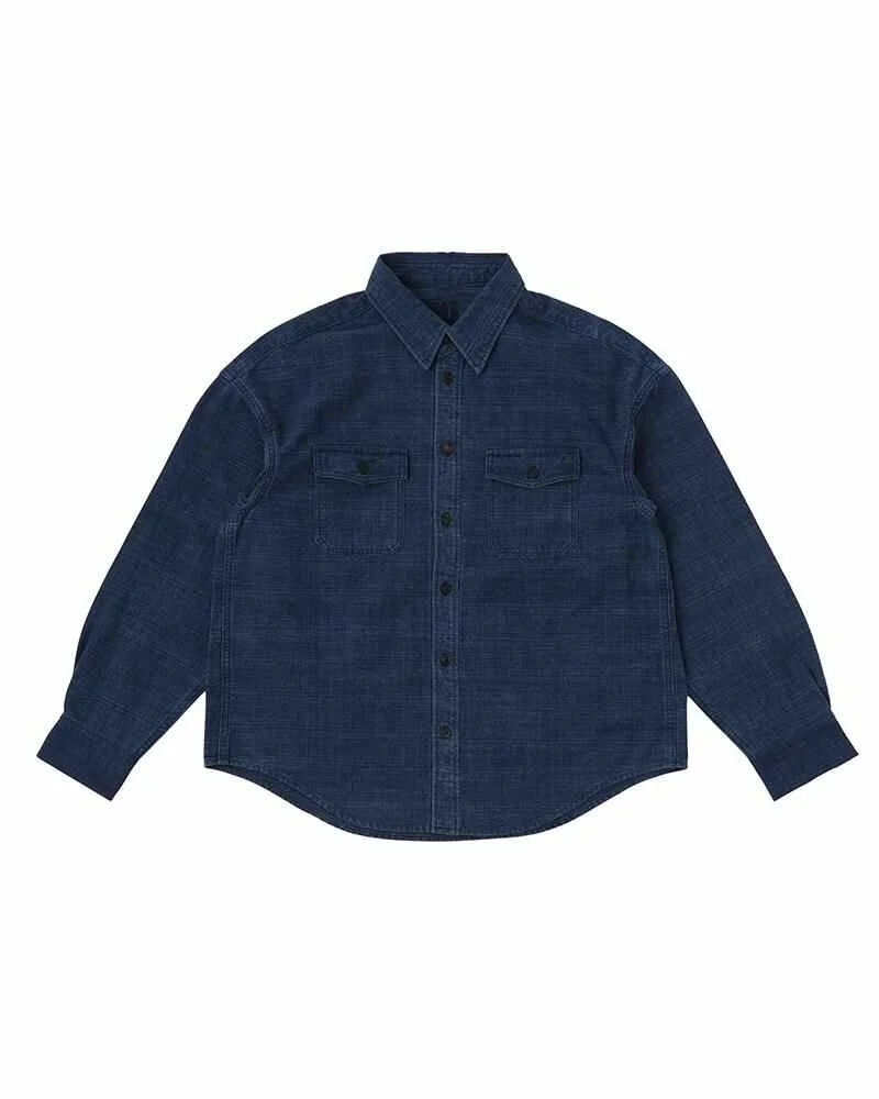PIONEER FLANNEL L/S COLOR: DK.INDIGO, IN DIGO, GREEN SIZE: 1, 2, 3, 4, 5 Shirt made from indigo skein-dyed flannel fabric Cuffs back detailing using old cloth (Kofu) Damaged finish Original water buffalo horn buttons Please Note : 100% Cotton SIZE 1 : Length 28 , Shoulder 24 , Sleeve 21.4 , Chest 46.8 (inch) SIZE 2 : Length 29 , Shoulder 24.6 , Sleeve 22 , Chest 48.4 (inch) SIZE 3 : Length 30 , Shoulder 25.1 , Sleeve 22.6 , Chest 50 (inch) SIZE 4 : Length 31 , Shoulder 25.9 , Sleeve 23.1 , Chest 51.9 (inch) SIZE 5 : Length 32 , Shoulder 26.7 , Sleeve 23.7 , Chest 53.9 (inch) Please be aware that the vintage fabric, bandanas, blanket, and african indigo fabric used may vary in color and pattern from item to item. With time, these fabrics may also become weaker and less tear-resistant. Also, due to the use of natural dyes, the outward appearance of items may vary slightly from one another. For certain items, mud may be applied for an added effect. Products may shrink slightly when washed.