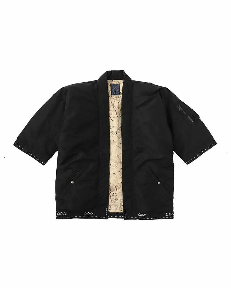 SANJURO KIMONO DOWN JKT COLOR: BLACK, OLIVE SIZE: 1, 2, 3, 4, 5 Down jacket made of densely woven army nylon twill Natural dyed Damaged finish White goose down filling Original snap button, Original Military Tape, Swiss riri zipper Please Note : 100% Nylon SIZE 1 : Length 72 , Shoulder 63.5 , Sleeve 33 , Chest 120.3 (cm) SIZE 2 : Length 74.5 , Shoulder 66 , Sleeve 34.5 , Chest 125.3 (cm) SIZE 3 : Length 77 , Shoulder 68.5 , Sleeve 36 , Chest 130.3 (cm) SIZE 4 : Length 79.5 , Shoulder 71 , Sleeve 37.5 , Chest 135.3 (cm) SIZE 5 : Length 82 , Shoulder 73.5 , Sleeve 39 , Chest 140.3 (cm) Please be aware that the vintage fabric, bandanas, blanket, and african indigo fabric used may vary in color and pattern from item to item. With time, these fabrics may also become weaker and less tear-resistant. Also, due to the use of natural dyes, the outward appearance of items may vary slightly from one another. For certain items, mud may be applied for an added effect. Products may shrink slightly when washed.