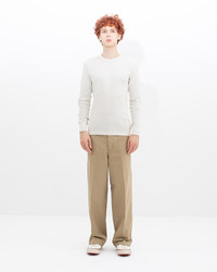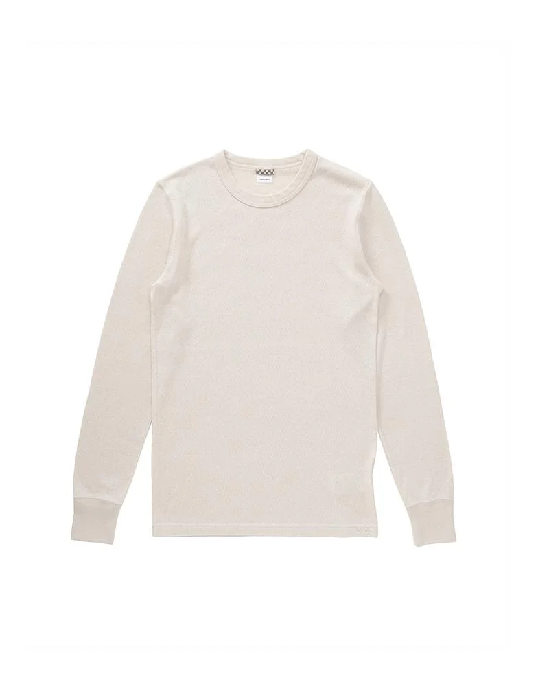 SUBLIG THERMAL CREW L/S COLOR: GREY, IVORY, WHITE SIZE: 1, 2, 3, 4, 5 Custom Cotton Cashmere Blend Crewneck Long Sleeve Thermal Shirt One Wash Hand-Stitch Decorative Detailing 90% Cotton 10% Cashmere UNIT:cm : Please be aware that there may be slight variations in the color of the fabric and pattern than shown in the images. There will be slight shrinkage when washing for the first time. SIZE LENGTH CHEST SHOULDER SLEEVE 1 66 82 37 62 2 68.5 87 39 63.5 3 71 92 41 65 4 73.5 97 43 66.5 5 76 102 45 68