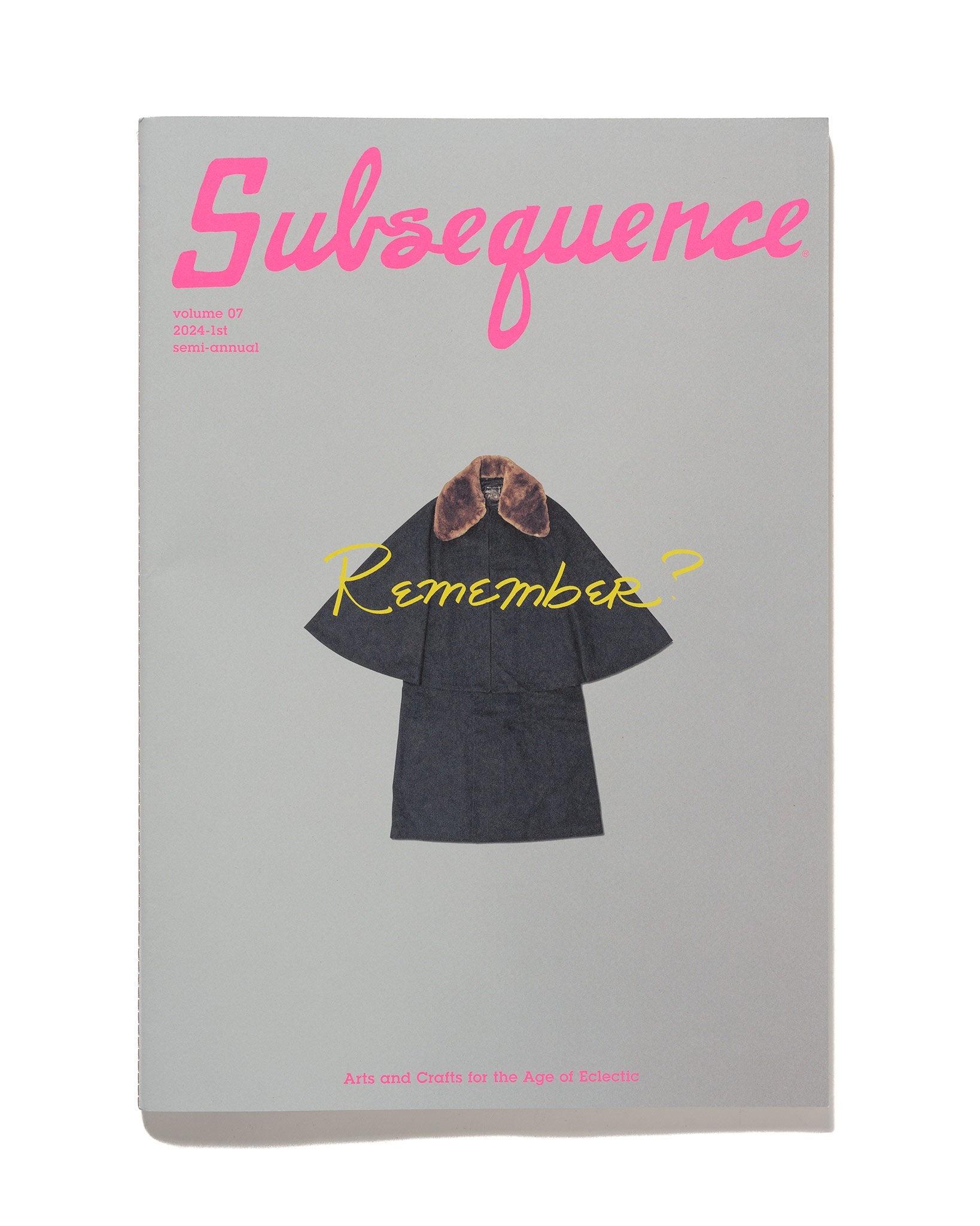 Subsequence Magazine Vol. 7, titled "Remember?", explores the profound concept of how individual histories, often lost in the passage of time, can be preserved through personal stories and shared memories. In this issue, visvim’s team travels across the globe to connect with creators, artists, and designers whose work bridges past and present, encapsulating the memories of those who live in their communities. Alongside insightful interviews, this issue introduces readers to lesser-known crafts, art, and culture from around the world. With stunning visuals and in-depth narratives, this edition celebrates creativity and the preservation of cultural heritage. DETAILS - 0619999999007 - Published bi-annually - Japanese and English text - 160 full colour pages - Printed in Japan
