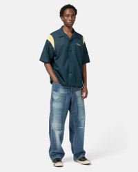 This elevated take on a vintage bowling shirt blends laid-back comfort with refined craftsmanship. Cut from a smooth wool-silk blend, it offers a soft, breathable feel with a subtle texture and sheen that elevates the casual look. A relaxed, boxy fit is enhanced by contrast shoulder panels, custom bone buttons, and a chest embroidery that nods to classic Americana. DETAILS - 0125105011012 - 62% Wool, 38% Silk - Relaxed, boxy fit - Pressed spread open collar - Contrast shoulder panels - Custom bone buttons - Button closure - Chainstitch embroidery at chest - Patch chest pocket - Made in Japan