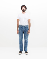 SOCIAL SCULPTURE 11 DRY-26 COLOR: ONE COLOR SIZE: 1, 2, 3, 4, 5 Custom 13 oz. DRY DENIM Pants Damaged Finish, Dry Salt Shrink Treatment Regular Fit, Slightly Tapered Silhouette, Medium-Rise, and Button Fly Blue Selvedge, Custom Hand-Made Copper Donut Button, and Hand Processed Rivets Natural Dyed Buckskin Patch with Sashiko Stitch Detail 100% COTTON UNIT:cm : This item features a fabric that has undergone a special treatment resulting in size variation with each piece. Also, when washing in water, this style will expand rather than shrink as seen with conventional denim. Please be aware that there may also be slight variations in the color of the fabric and pattern than shown in the images. SIZE LENGTH INSEAM WAIST THIGH WIDTH HEM 1 96.5 72.3 82.7 31.3 18.6 2 99 74.3 87.7 32.5 19.8 3 101.5 76.3 92.7 33.7 21 4 104 78.3 97.7 34.9 22.2 5 106.5 80.3 102.7 36.1 23.4
