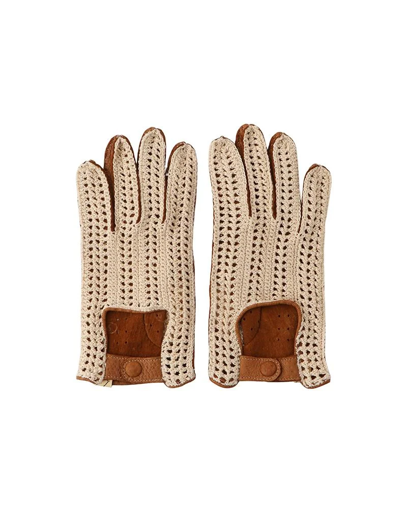 VMC CROCHET DRIVING GLOVES COLOR: BLACK, BROWN SIZE: S, ML, L, XL, XXL A Hand Sewn pair of Driving Gloves made with a knit cotton crochet material that is combined with Italian peccary leather UNIT:cm : The natural leather hides have been specially treated to create a unique texture which creates wrinkles and variation in size, expression, and hue where no two pieces are alike. Please be aware that there may be slight variations in color or pattern from the images shown due to the nature of the material being used. SIZE LENGTH WIDTH S 22 10 ML 22.5 10.5 L 23 11 XL 23.5 11.5 XXL 24 12
