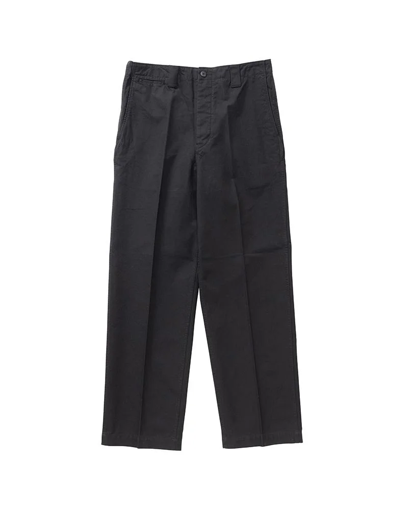 WIDE CHINO PANTS COLOR: BLACK, KHAKI, BEIGE SIZE: 1, 2, 3, 4, 5 Custom High Density Weave Long Staple Cotton Chino Pants One Wash Straight Silhouette and High-Rise Custom Water Buffalo Buttons 100% Cotton UNIT:cm : Please be aware that there may be slight variations in the color of the fabric and pattern than shown in the images. There will be slight shrinkage when washing for the first time. SIZE LENGTH INSEAM WAIST THIGH WIDTH HEM 1 105.5 73.5 76 32.6 21.1 2 108 75.5 81 33.8 22.3 3 110.5 77.5 86 35 23.5 4 113 79.5 91 36.2 24.7 5 115.5 81.5 96 37.4 25.9