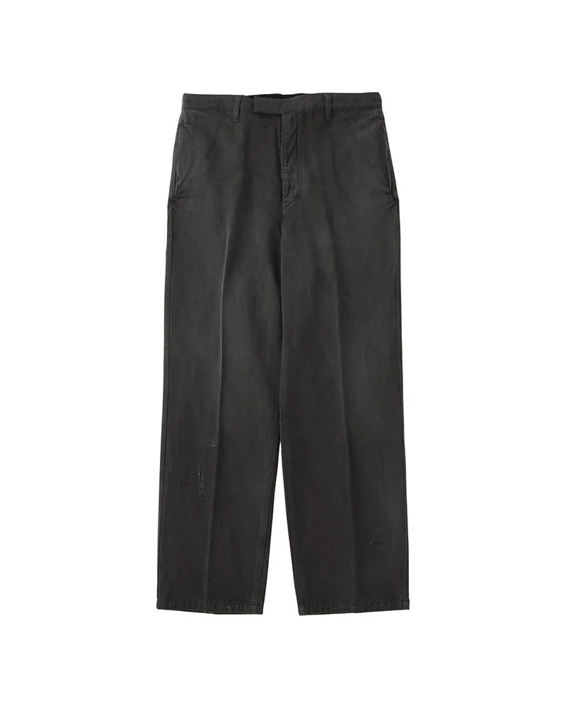 WIDE SLACKS DMGD COLOR: BLACK, NAVY, BLUE SIZE: 1, 2, 3, 4, 5 A Pants made from a custom Wool/Linen Gabardine fabric s Garment Dyed and Damaged Finish Custom PEERLESS Engraved Metal Button Custom Water Buffalo Buttons 83% WOOL 17% LINEN UNIT:cm : Please be aware that there is a possibility for slight variations in the color appearance and pattern on the fabric that is utilized for this product; each finished garment may be different from the displayed product image. There may also be some shrinkage following the first wash of this product. The Kofu, Bandana, Blanket, African Indigo textile and vintage fabrics used for the name tag and actual product itself vary in color and pattern where no two pieces are alike. Additionally, the degree of deterioration will vary with each fabric depending on its age and historical use so these products should be considered more fragile in comparison to our regularly manufactured products. SIZE LENGTH INSEAM WAIST THIGH WIDTH HEM 1 101.5 70.6 83 33.8 21 2 104 72.6 88 35 22.2 3 106.5 74.6 93 36.3 23.5 4 109 76.6 98 37.5 24.7 5 111.5 78.6 103 38.8 26
