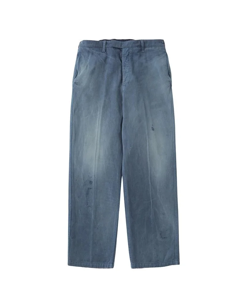 WIDE SLACKS DMGD COLOR: BLACK, NAVY, BLUE SIZE: 1, 2, 3, 4, 5 A Pants made from a custom Wool/Linen Gabardine fabric s Garment Dyed and Damaged Finish Custom PEERLESS Engraved Metal Button Custom Water Buffalo Buttons 83% WOOL 17% LINEN UNIT:cm : Please be aware that there is a possibility for slight variations in the color appearance and pattern on the fabric that is utilized for this product; each finished garment may be different from the displayed product image. There may also be some shrinkage following the first wash of this product. The Kofu, Bandana, Blanket, African Indigo textile and vintage fabrics used for the name tag and actual product itself vary in color and pattern where no two pieces are alike. Additionally, the degree of deterioration will vary with each fabric depending on its age and historical use so these products should be considered more fragile in comparison to our regularly manufactured products. SIZE LENGTH INSEAM WAIST THIGH WIDTH HEM 1 101.5 70.6 83 33.8 21 2 104 72.6 88 35 22.2 3 106.5 74.6 93 36.3 23.5 4 109 76.6 98 37.5 24.7 5 111.5 78.6 103 38.8 26
