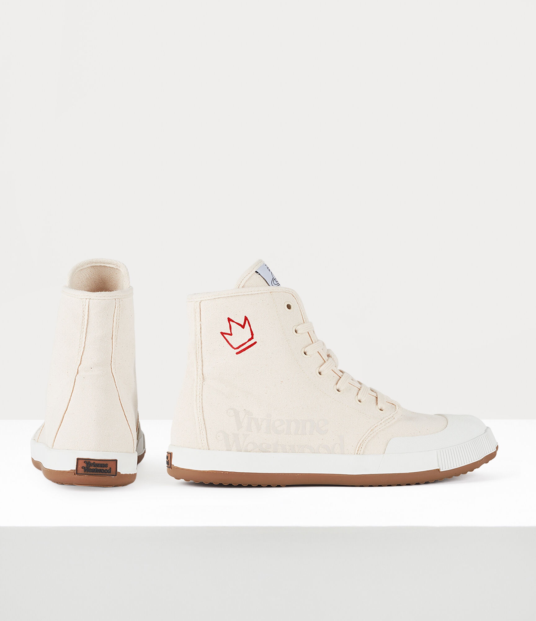 These high-top Animal Gym trainers feature a subtle animal toe-shaped rubber outsole, referencing previous designs from Vivienne's archive. Code: 7502005AW-W0005--natural - Printed branding - Crown motif - Lace-up design - Fve eyelets - Woven label at tongue - Embossed branding on sole - Tonal stitching COMPOSITION - 70% Recycled cotton - 30% Cotton - Rubber outsole