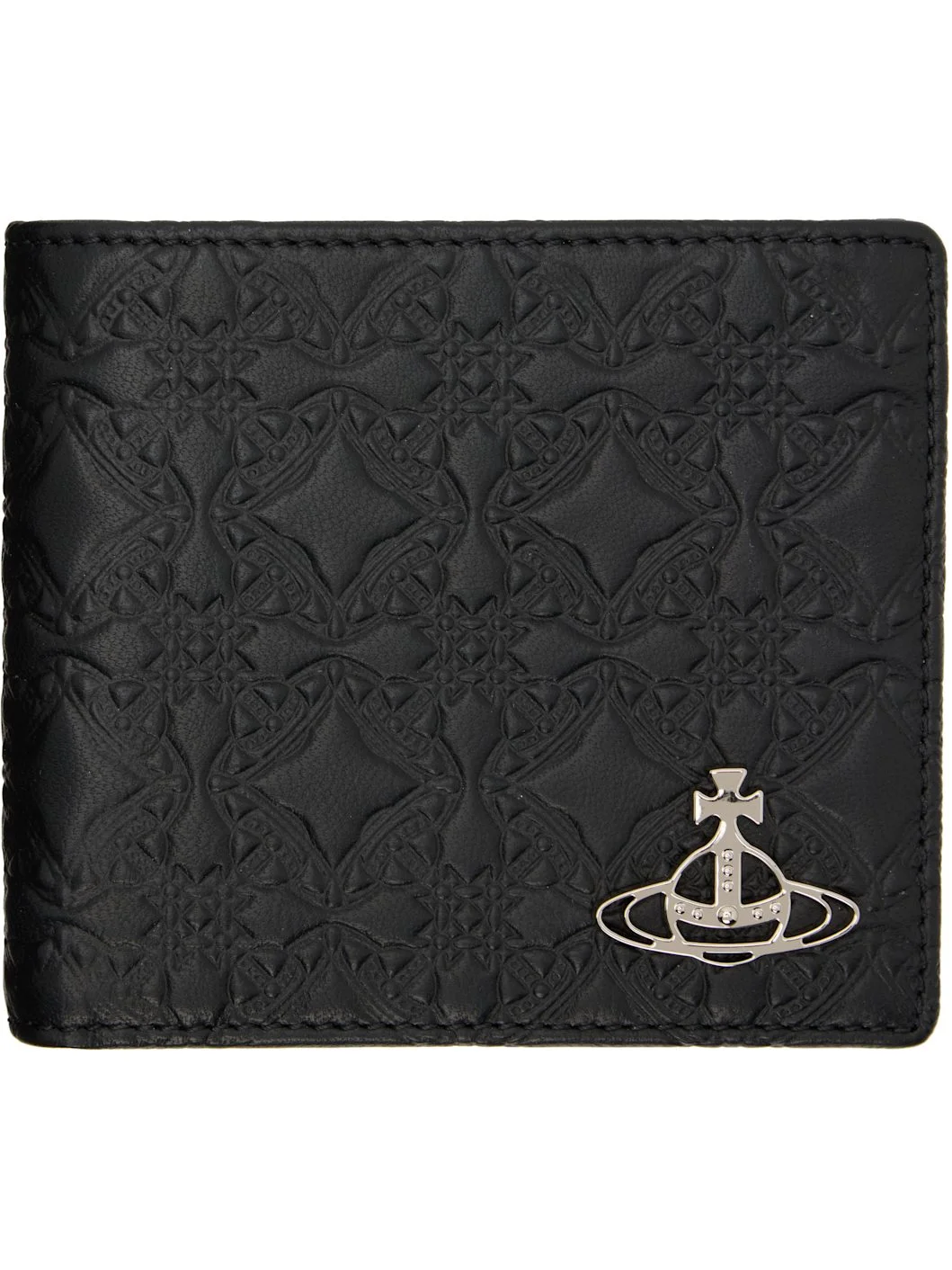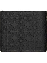 Buffed nappa leather bifold wallet. · Logo pattern embossed throughout · Logo hardware at face · Six card slots and two patch pockets at interior · Two note slots · Twill lining · H3.75" x W4.25" x D0.75" Supplier color: Black Leather. Made in Italy 252314M164035