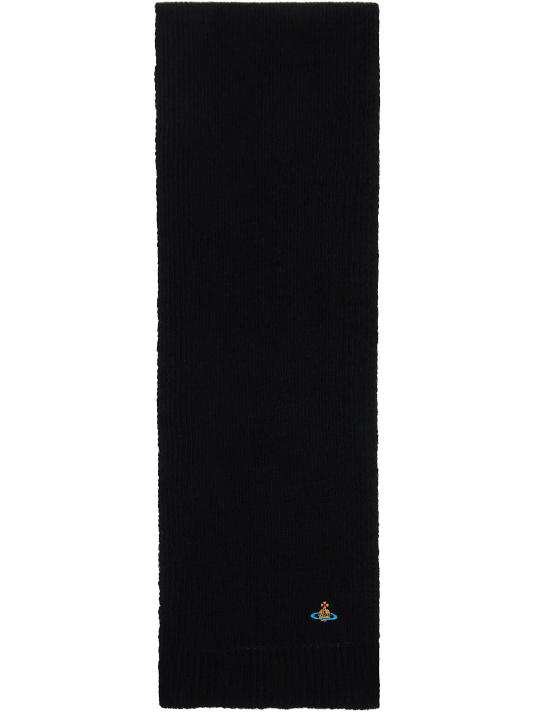 Rectangular knit cashmere scarf. · Logo embroidered at face · Rib-knit ends · L86" x W7.5" Supplier color: Black 100% cashmere. Made in Italy 252314M150003