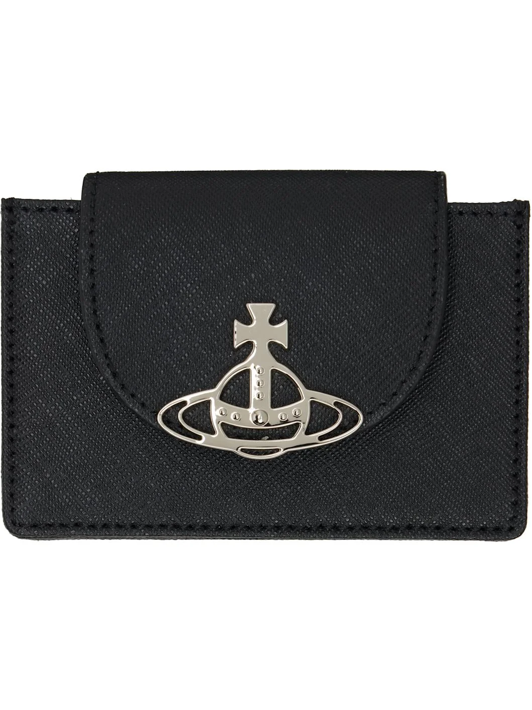 Saffiano leather card holder. · Accordion panel at sides and base · Logo hardware at adjustable pin-buckle foldover strap · Five card slots · H2.5" x W4" x D0.75" Supplier color: Black Leather. Made in Italy 261314M163040