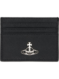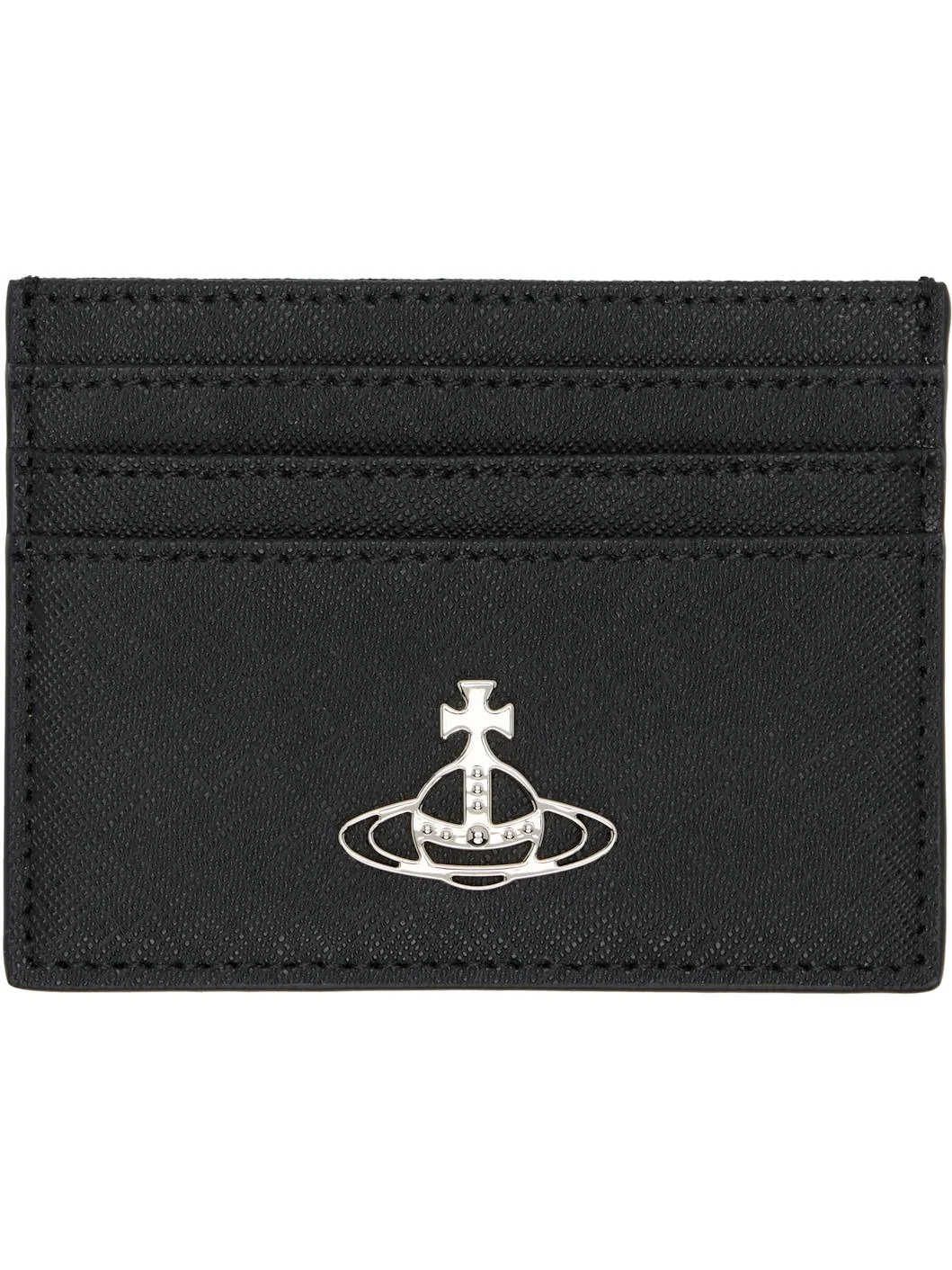 Saffiano leather card holder. · Logo hardware at face · Four card slots · Central note slot · Twill lining · Silver-tone hardware · H3" x W4" Supplier color: Black Leather. Made in Italy 252314M163003