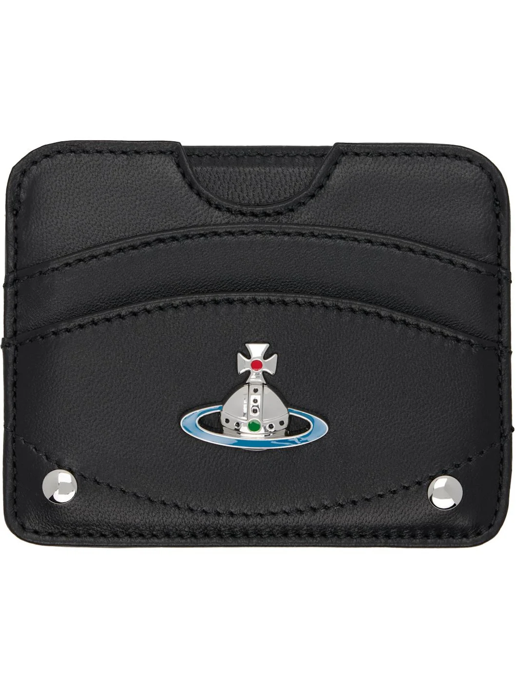 Buffed nappa lambskin card holder. · Enameled logo hardware and rivets at face · Two card slots · Central note slot · Twill lining · Silver-tone hardware · H3.25" x W4" Supplier color: Black Lambskin. Made in Italy 252314M163005