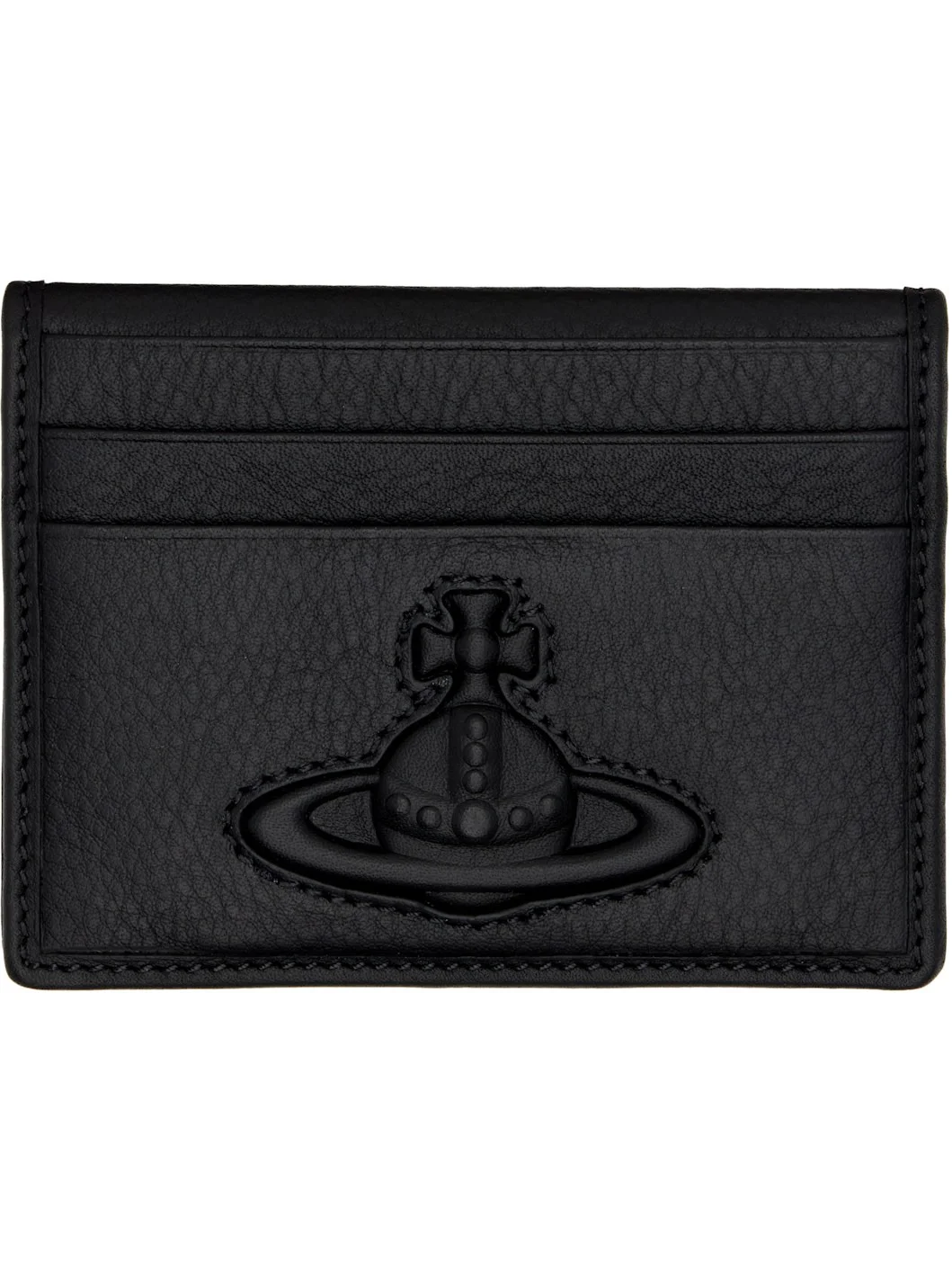 Grained leather bifold card holder. · Logo embossed at face · Three card slots at face · Three card slots at back face · Six card slots at interior · Twill lining · H3" x W4" x D0.5" Supplier color: Black Leather. Made in Italy 252314M163007