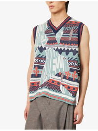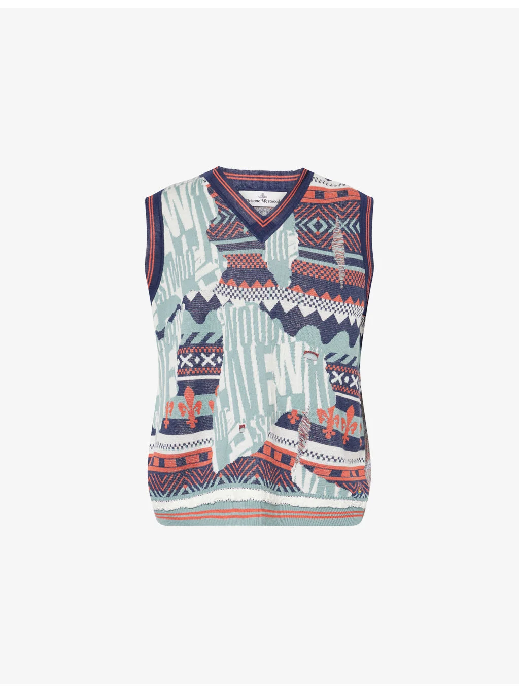 PRODUCT DETAILS - Vivienne Westwood wool, linen and cotton vest - 66% wool, 23% linen, 11% cotton - Relaxed fit, V-neck, sleeveless, abstract intarsia and orb embroidery at front, all-over knitted, ribbed striped trims - Hand wash cold - Made in Italy - Model is 6ft 2in/1.88m and wears a size medium - Midweight, stretchy Ref: R04467277