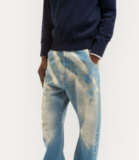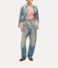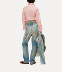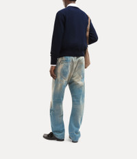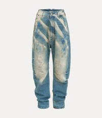 Our Buckle Back jeans feature a diagonal bleached-fade effect, paired with a mid-rise waistband that fastens with an orb-embossed pearl button. At the back, a refreshed ‘Westwood’ leather patch and our signature 'VW' topstitching on the pockets complete the design. Code: 39020012-W018A--BLUE - Features a mid-blue denim base - Diagonal bleached fade effect across the front - Classic five-pocket construction - Straight-leg silhouette - High-rise waist with belt loops - Back cinch belt detail for an adjustable fit - Contrasting stitching throughout - Branded leather patch on the back waistband. - Distressed detailing - Unisex design - Women sample size: S Men sample size: M COMPOSITION - 100% Organic cotton - Organic fibres are natural fibres grown with strict rules concerning the use of synthetic pesticides, insecticides, or herbicides and GMOs (Genetic Modified Organisms).