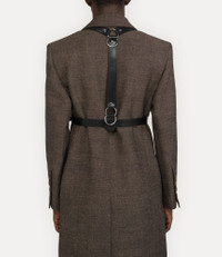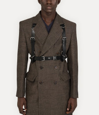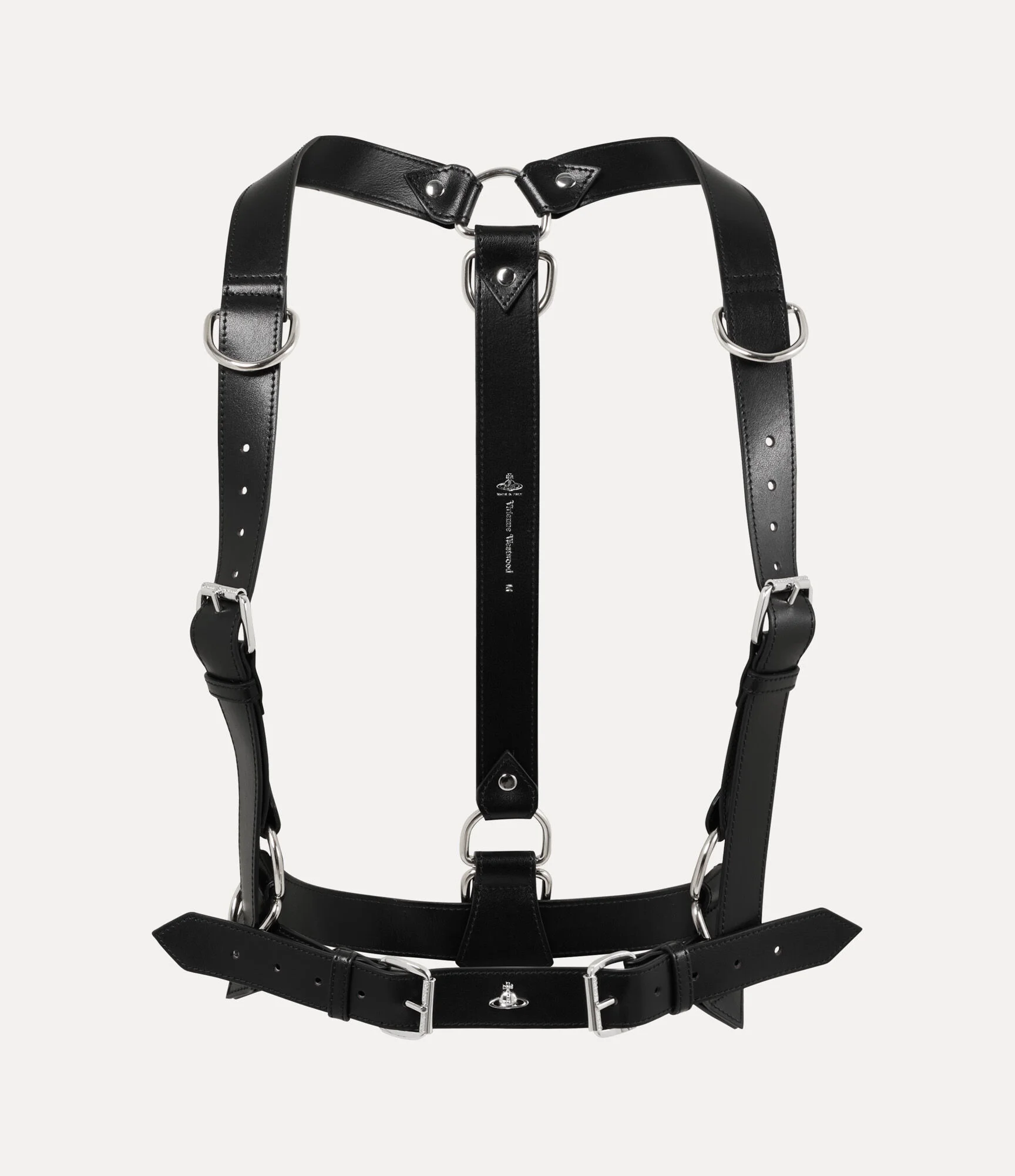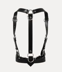 The Equestrian harness draws inspiration from traditional stable-wear and the house’s archival bondage elements, reminiscent of the Spring–Summer 1995 ‘Erotic Zones’ collection. Crafted from smooth leather, the piece is detailed with metal hardware and features adjustable double-buckle fastenings throughout, nodding to the house’s signature Alex belt, and is finished with the bas-relief metal orb motif at the centre. Code: 82110005U-L002V--BLACK - Features hoop and stud detailing - Bas relief orb motif - Roller bucked fastening - Punch hole details - D-ring details - Polished hardware - Smooth finish - S - waist 71.5cm, shoulder to waist 53cm - M - waist 79cm, shoulder to waist 55cm - L - waist 96cm, shoulder to waist 55cm - Made in Italy COMPOSITION - 100% Cow leather