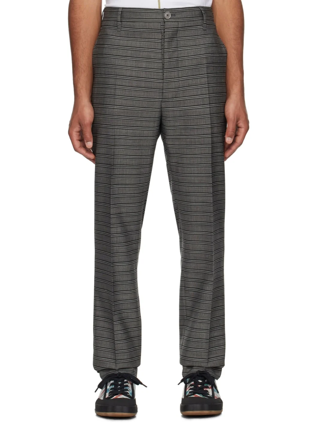 4sustainability®- and ZDHC-certified virgin wool delaine trousers. Stripes throughout. · Belt loops · Three-pocket styling · Button-fly · Creased legs · Partial logo-woven satin lining Supplier color: Black/White Body: 100% virgin wool. Lining 1: 100% cotton. Lining 2: 100% viscose. Made in Italy 232314M191023