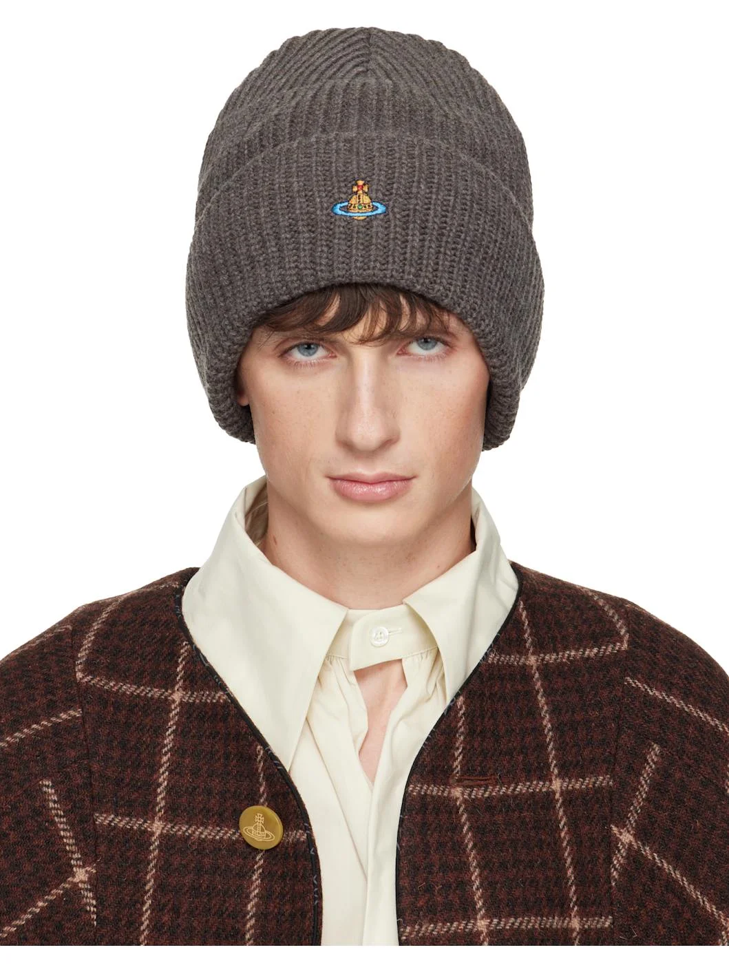 Rib-knit wool beanie. Logo embroidered at rolled brim. Supplier color: Grey 100% wool. Made in Italy 252314M138004