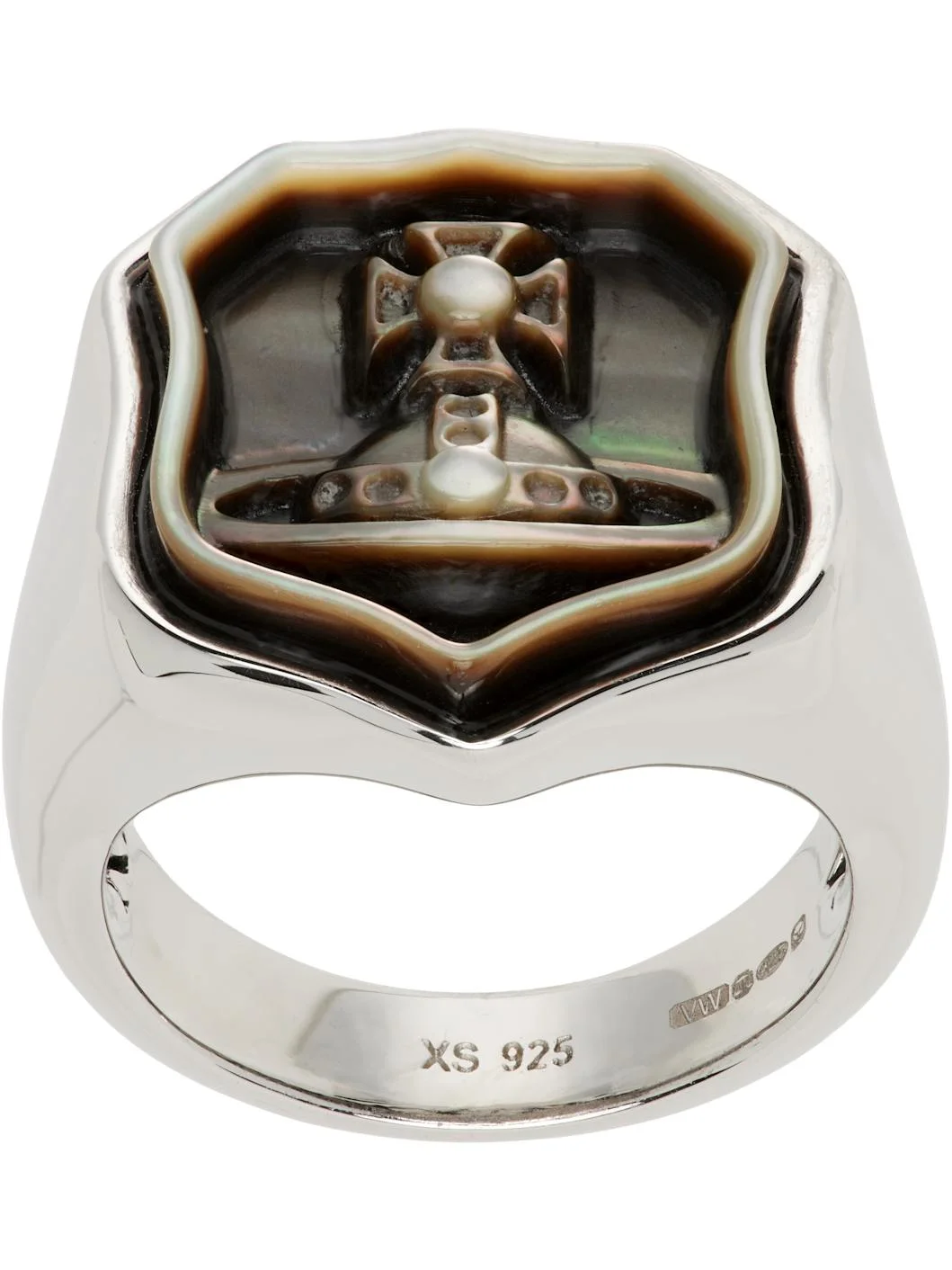 Signet ring in sterling silver. · Logo and mother-of-pearl accent at face · Logo engraved at inner band Supplier color: Platinum/Grey mop 925 sterling silver, mother-of-pearl. Made in Thailand 252314M147018