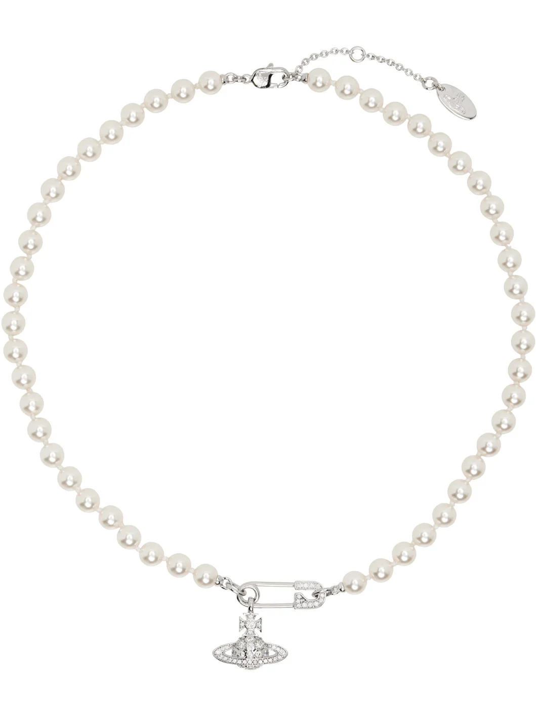 Beaded faux-pearl necklace in white. · Safety pin and logo charm with crystals · Logo plaque at adjustable lobster-clasp fastening · Brass hardware · L17" Supplier color: Platinum/Light Creamrose Pearl/White CZ Glass, brass. Made in Thailand 261314M145083