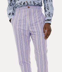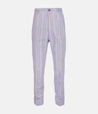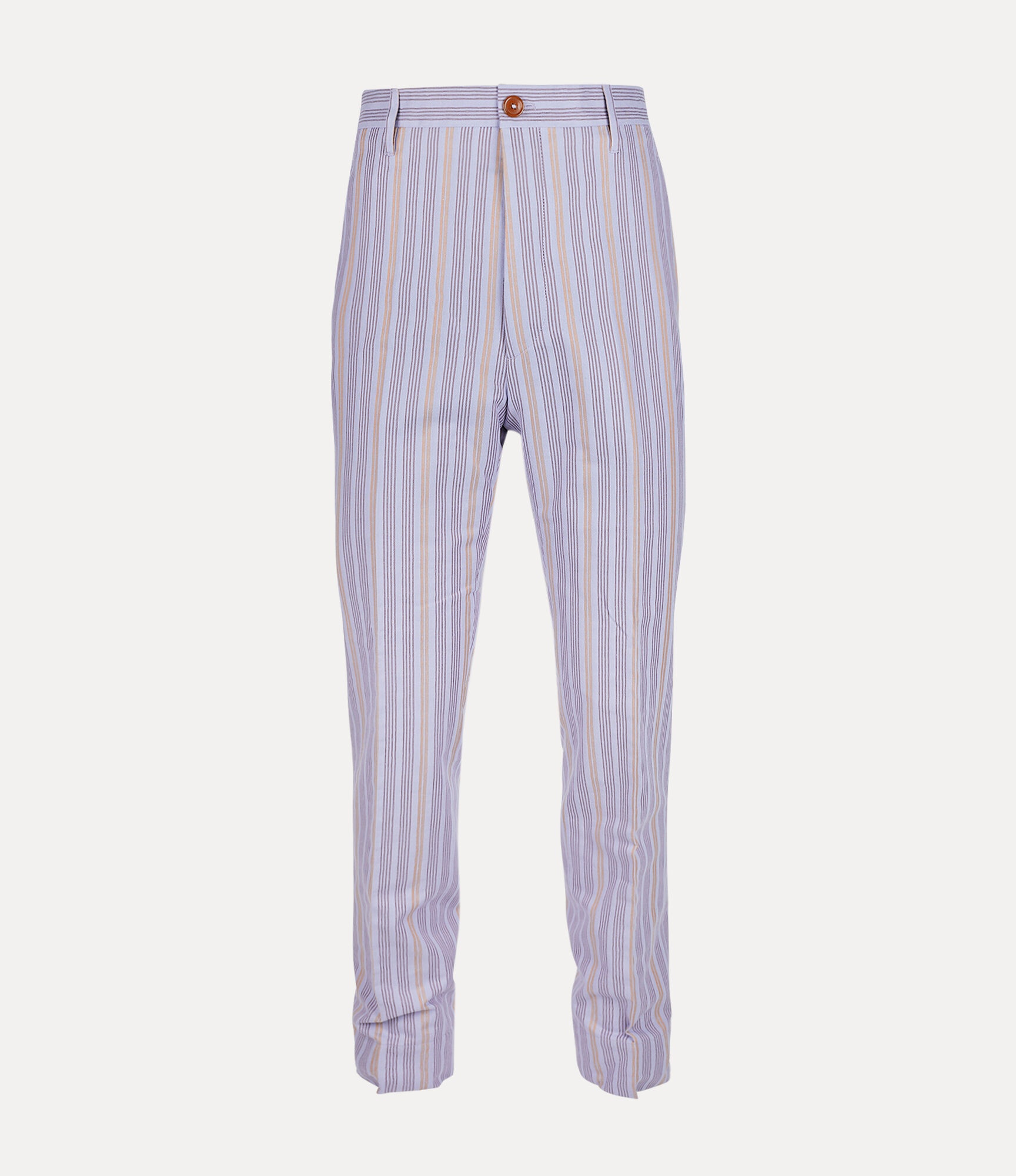 Our Cruise trousers in cotton feature a mid-rise waistband with pastel stripes, reminiscent of an early costume design sketch by Pablo Picasso for the ballet 'Le Tricorne'. The trousers are tailored for a slim fit and fasten at the front with an amber button. Code: 2F01000I-W003P--LILAC - Tonal stitching - Belt loops - Darting detailing - Mid-rise waistband - Straight leg - Button and zip-fly fastening COMPOSITION - 100% Cotton