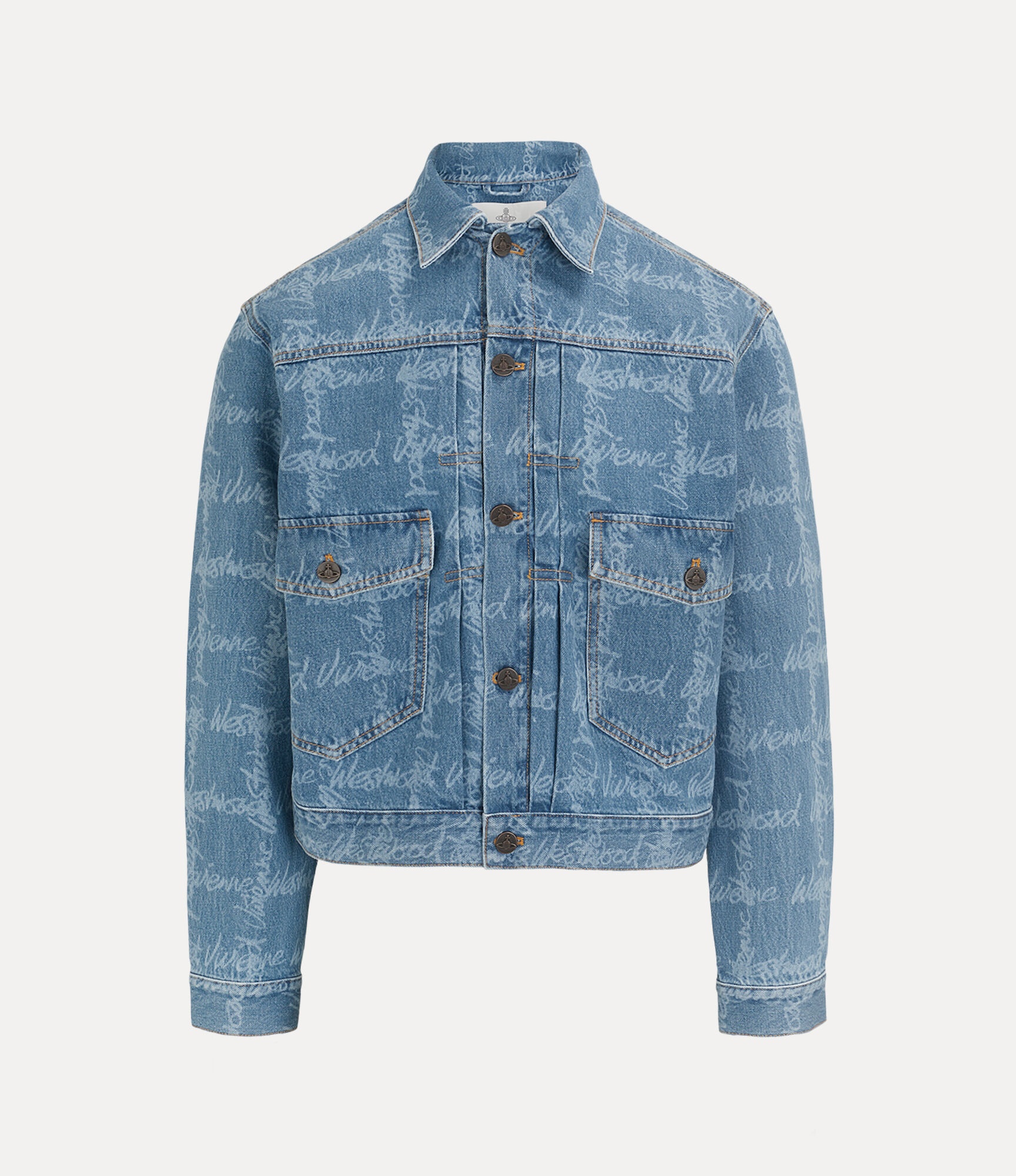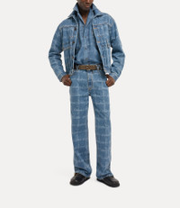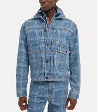 This season, our classic Marlene jacket returns in a soft denim fabric, complete with a classic all-over faded wash that pays homage to the American Midwest of the 1930s, a key inspiration of the collection. The piece reimagines Vivienne's distinctive signature motif, which has been designed in a grid-like pattern, reflecting the house's punk ‘DIY’ aesthetic. Code: 2801000E-W014I--VW-GRID-BLUE - Features orb-embossed buttons - Fits true to size, take your normal size - Classic pointed collar - Front pockets - Woven label at neckline - Model is 6'1.5/187cm and wearing a size M COMPOSITION - 100% Cotton
