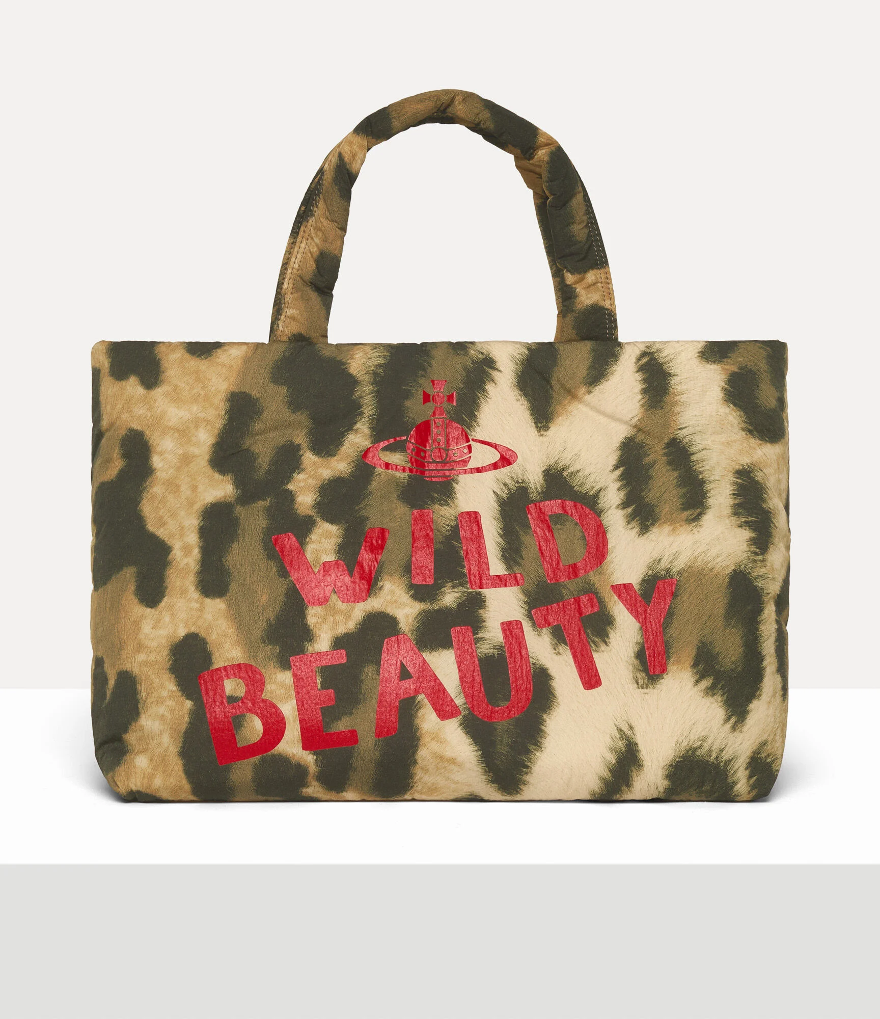 Our Maud Large tote bag is crafted from padded nylon and adorned with a bold leopard print motif, recalling the house’s signature Autumn-Winter 2001 Gold Label collection, 'Wild Beauty'. Shaped to a timeless trapeze silhouette with dual top handles, the piece offers a soft yet structured profile. Code: 8053195303786 - Features a leopard-print exterior - Boxy trapeze silhouette - Structured base with a widening top - Padded dual top handles - Bold printed slogan - Printed orb motif - Contrasting red accents - Soft, flexible structure - Spacious enough for everyday essentials - Statement design - Made in Japan COMPOSITION - Main material: 100% nylon - Lining: soft cotton