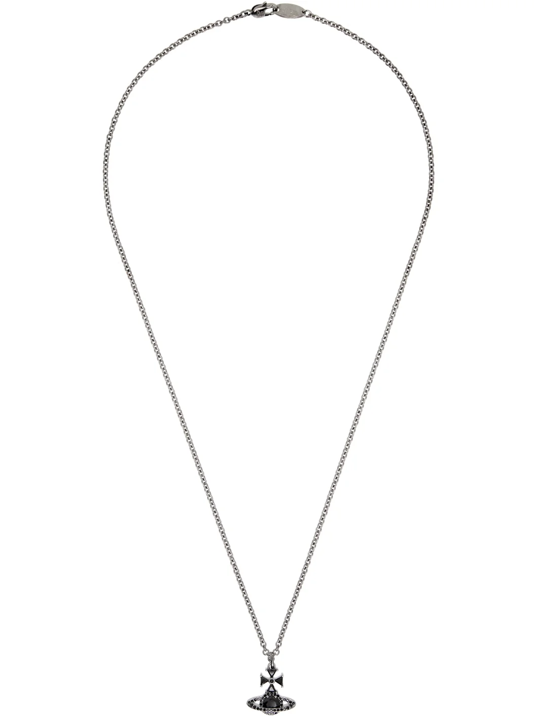 Cable chain necklace in gunmetal-tone brass. · Logo pendant with crystals · Logo plaque at lobster-clasp fastening · L21.5" Supplier color: Ruthenium/Jet cz Brass, crystal. Made in Thailand 261314M145038