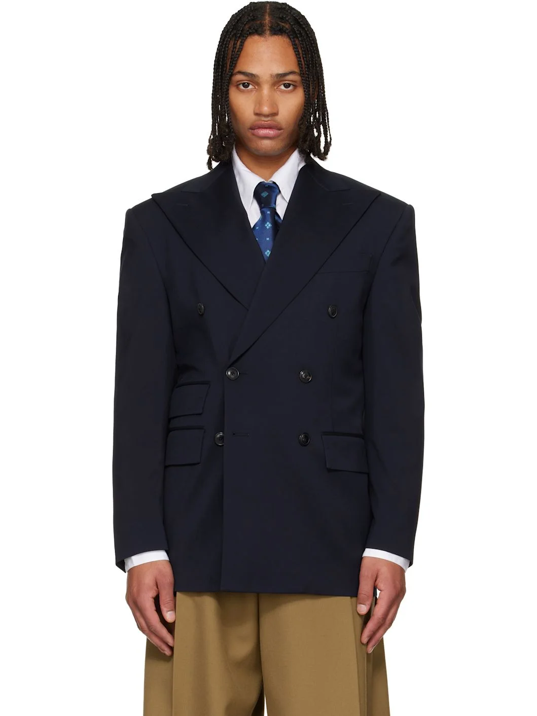 Virgin wool twill blazer. · Peaked lapel · Double-breasted button closure · Welt pocket at chest · Flap pockets at waist · Padded shoulders · Surgeon's cuffs · Twin vents at back hem · Welt pocket at interior · Full logo-woven satin lining Supplier color: Navy Body: 100% virgin wool. Trim: 100% cotton. Lining: 100% viscose. Made in Italy 252314M195000