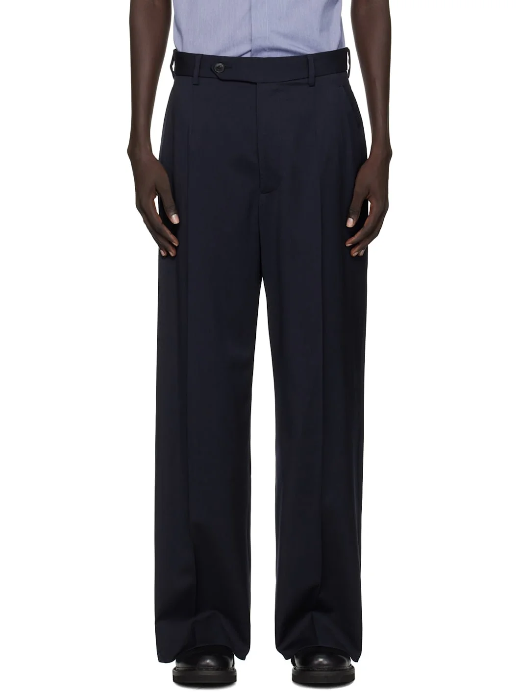 Virgin wool twill trousers. · Belt loops · Three-pocket styling · Zip fly · Darts at front and back · Creased legs · Notch at back waistband · Partially lined Supplier color: Navy Body: 100% virgin wool. Lining: 100% viscose. Trim: 100% cotton. Made in Italy 252314M191001